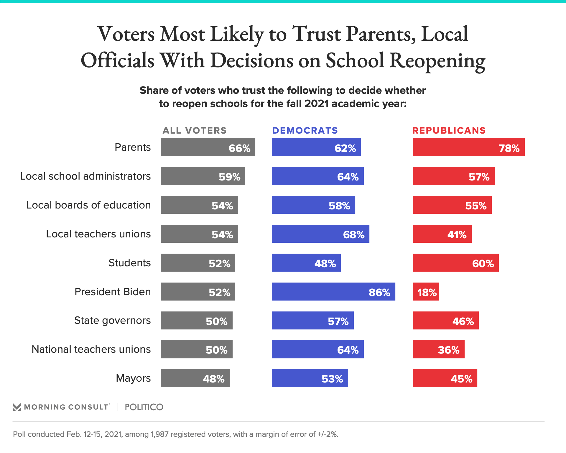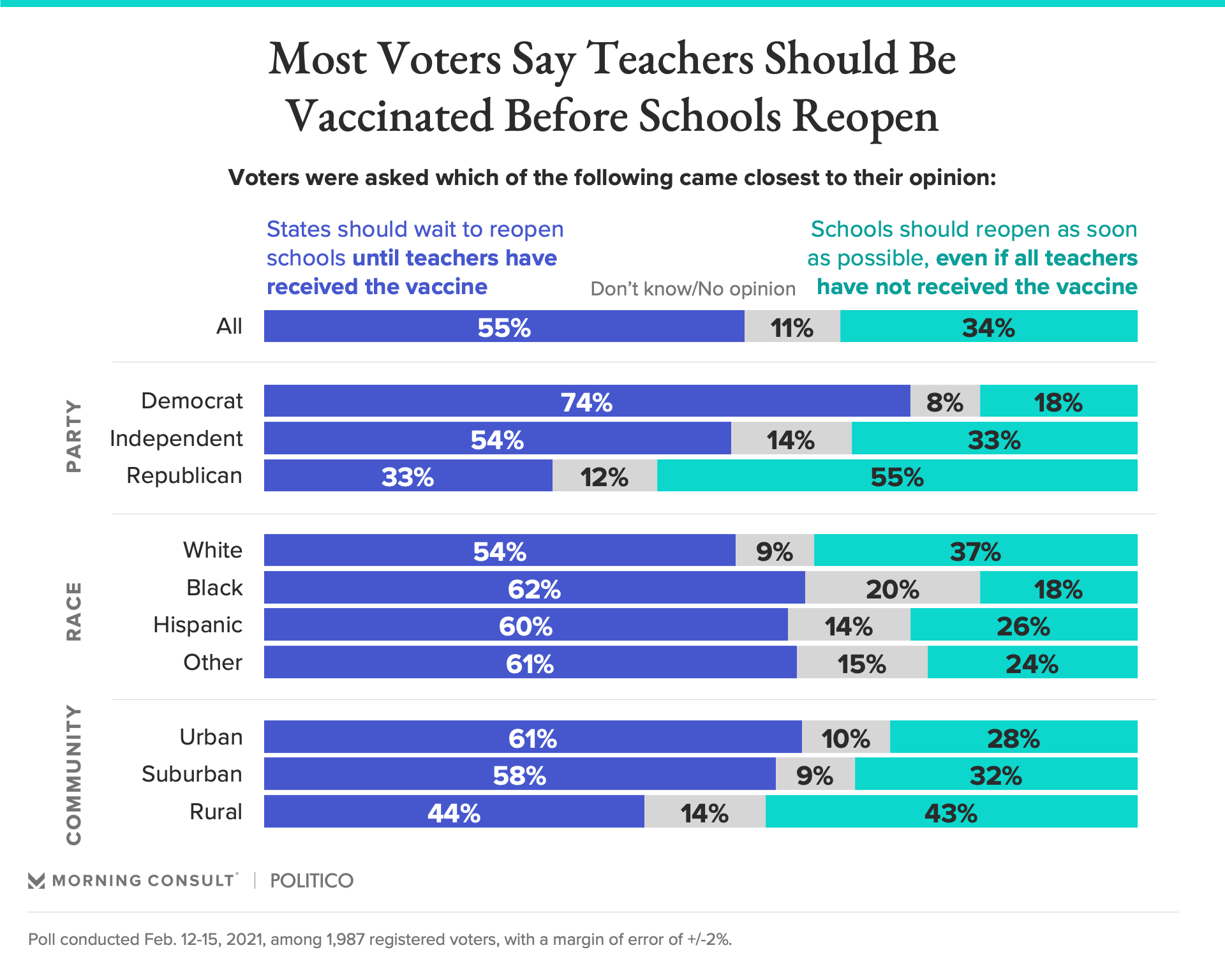 According to a new Morning Consult/Politico poll, 55 percent of voters said states should wait to reopen schools until teachers have received the vaccine, while 34 percent said schools should be reopened as soon as possible, even if not every teacher has been vaccinated.