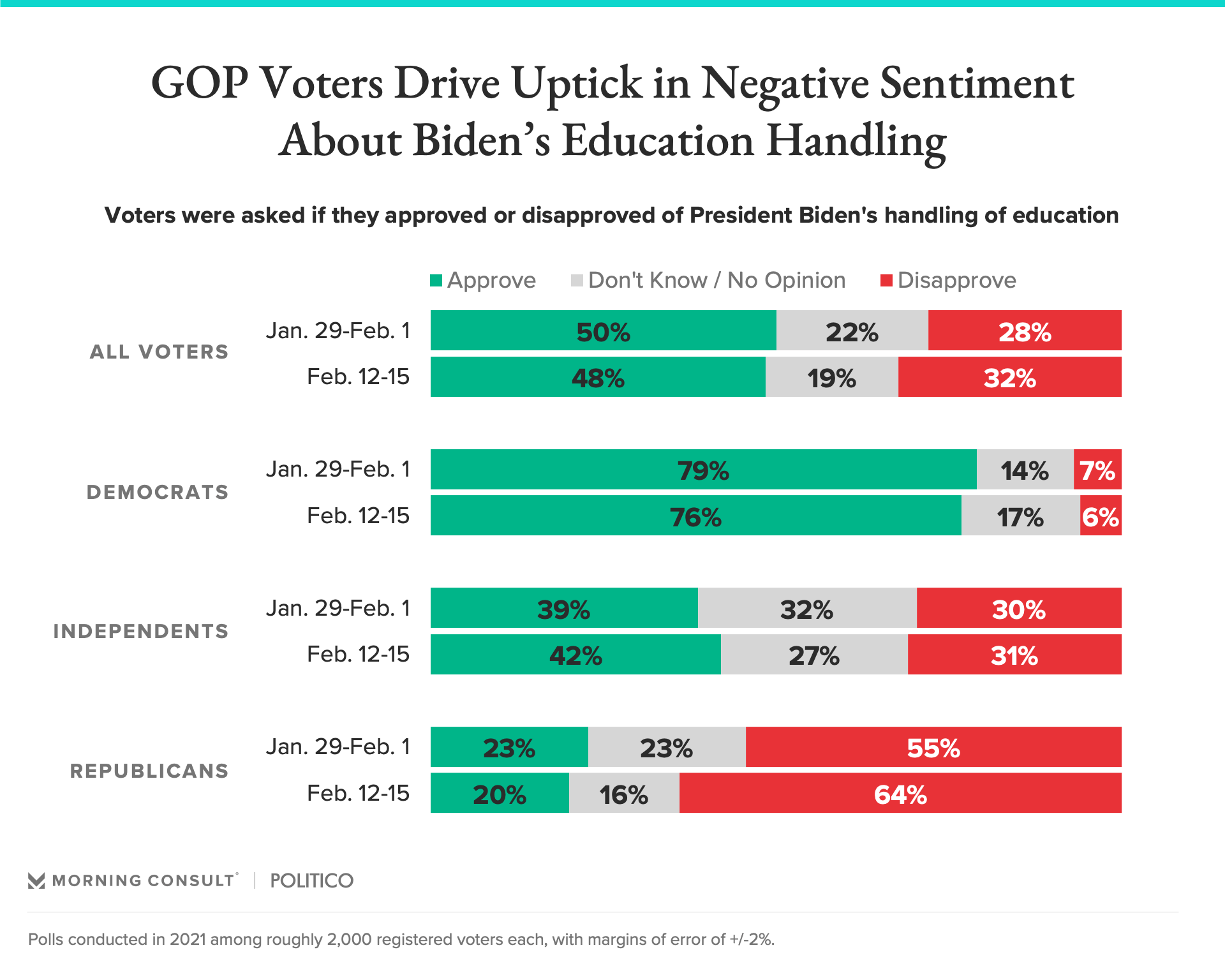 Nearly a month into his presidency, Biden continues to get good marks on his handling of the pandemic, with 60 percent approval on the subject, virtually unchanged since a survey conducted Jan. 29-Feb. 1. But he’s earned some disfavor on the issue of education: 48 percent approve of his job performance and 32 percent disapprove, up 4 percentage points over two weeks, driven by an increase of 9 points among Republicans.