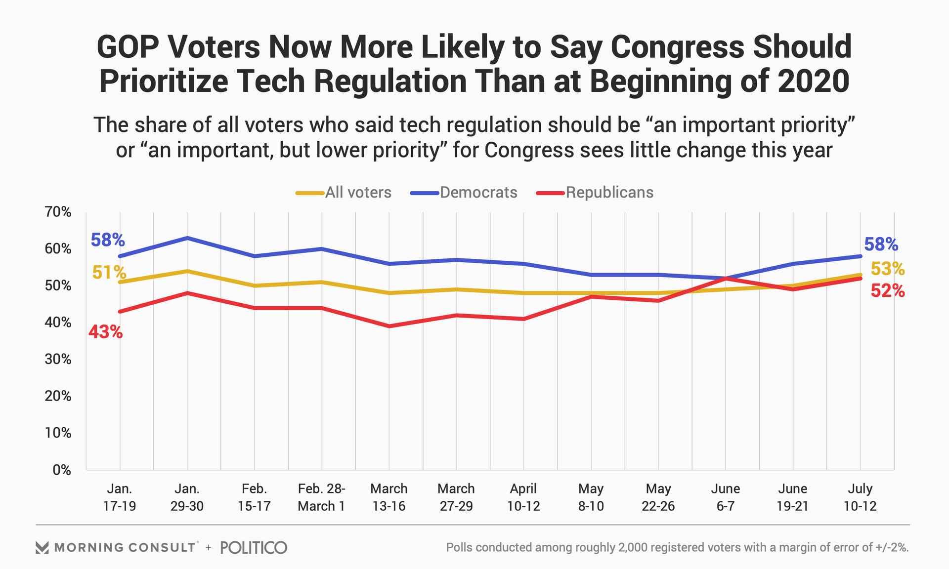 In a survey conducted July 10-12, Democratic voters were slightly more supportive of Congress making tech regulation a priority (58 percent) than Republican voters (52 percent). While the same share of Democrats showed interest in tech reform in a January survey on the topic, GOP voters are now 9 percentage points more likely since the beginning of the year to voice support for congressional regulation of tech companies.