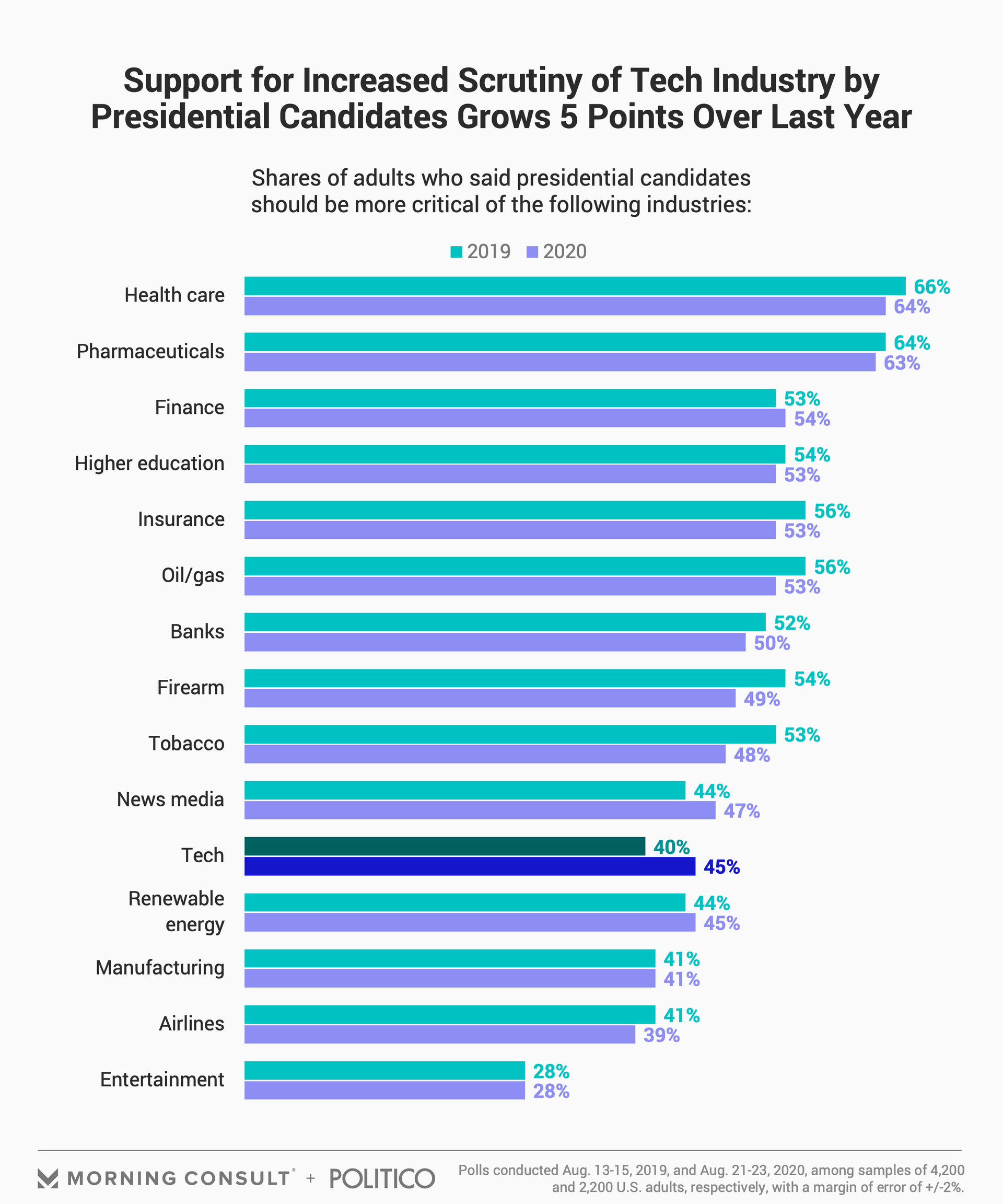 According to a new Morning Consult/Politico survey, 45 percent of adults want presidential candidates to be more critical of the technology industry, up 5 percentage points from an August 2019 survey that asked the same question. That slight growth is also seen among Democrats and Republicans: 48 percent of Democrats and 49 percent of Republicans now want candidates to be more critical of the industry -- 6- and 5-point jumps, respectively, from last year.