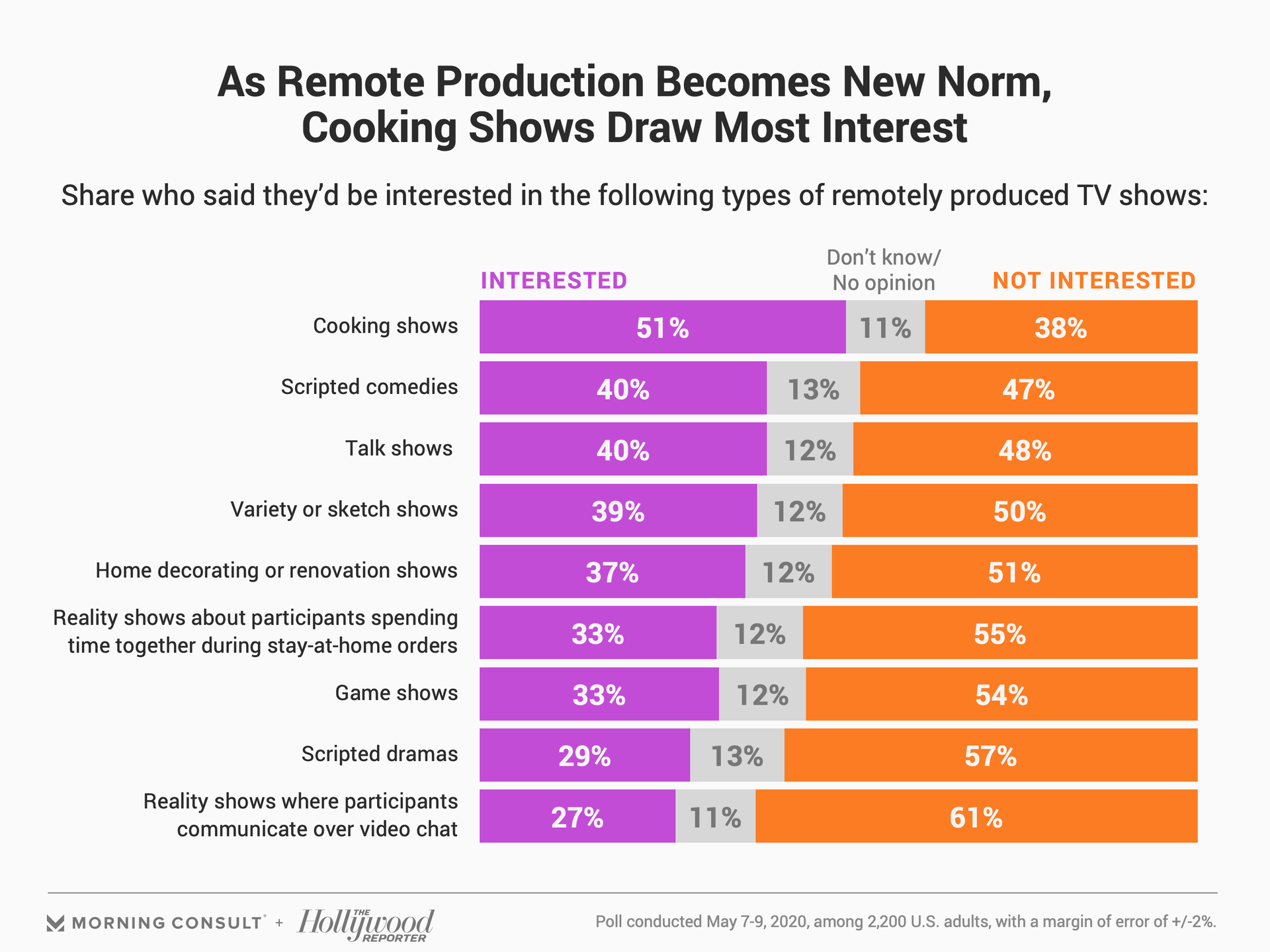 Interest in remote productions extends beyond the talk and variety genres. Just over half of all adults said they would be interested in watching a cooking show filmed by the host at home. And while 40 percent said they would be interested in watching a scripted comedy where the actors filmed themselves separately, there was less enthusiasm (29 percent) for scripted dramas.