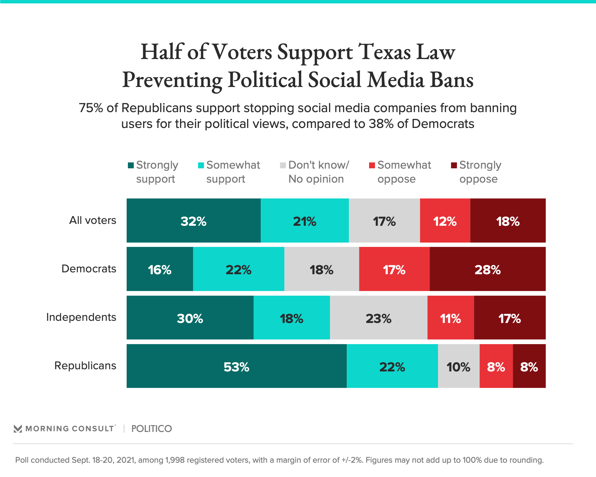 Texas Law Preventing Social Media Bans Based on Political Viewpoints Has Backing From Just Over Half of Voters