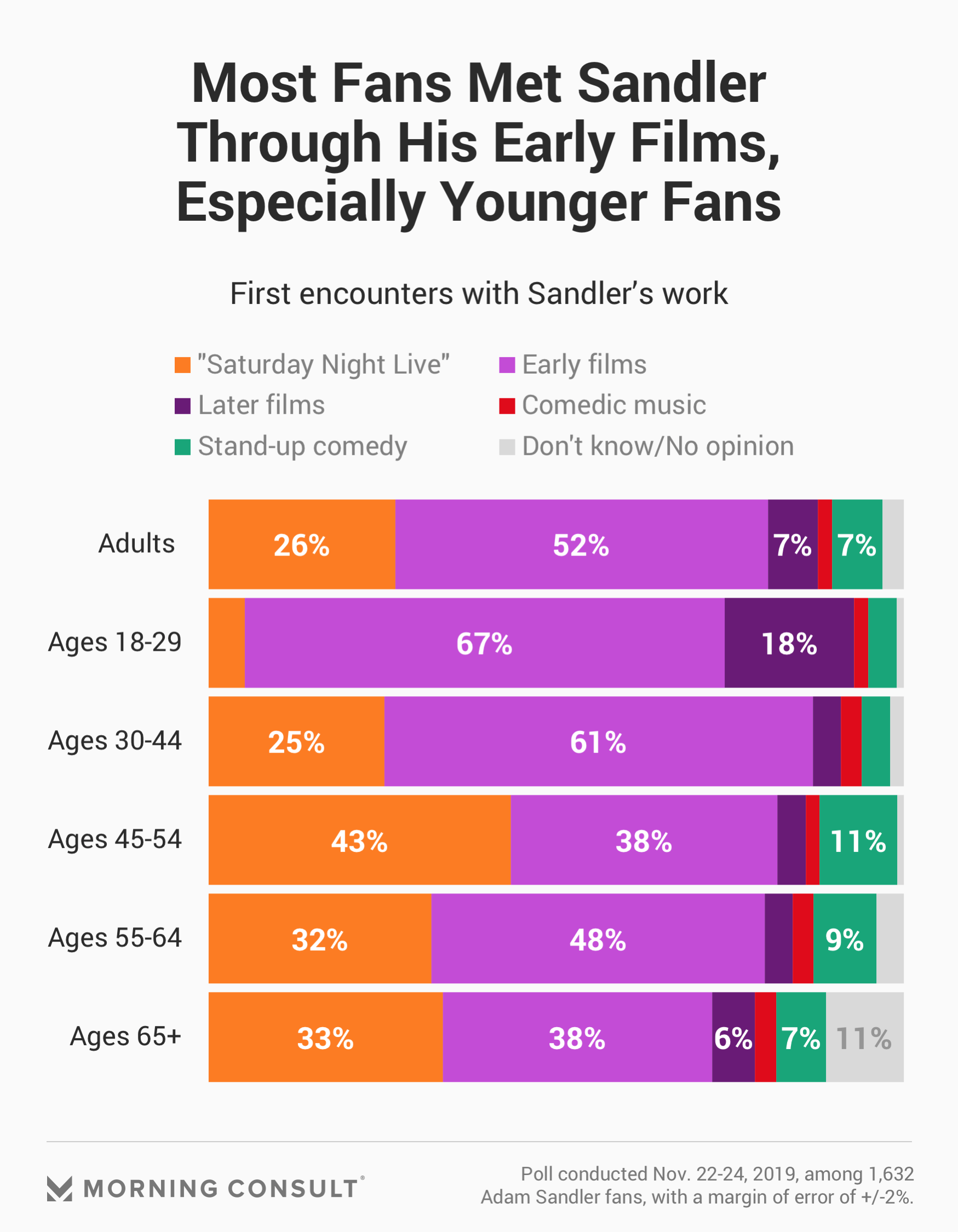 Much of his popularity may be a result of his early work: A Nov. 22-24 survey of 2,200 adults found that 52 percent of the 1,632 self-described Sandler fans said they first encountered him through his early films, including “Billy Madison” and “Happy Gilmore,” while 26 percent said their first introduction to Sandler was as a cast member on “Saturday Night Live.” Even 67 percent of those ages 18 to 29 -- some of whom weren’t even born when “Happy Gilmore” was released -- said the early Sandler films were their first experience with the actor.