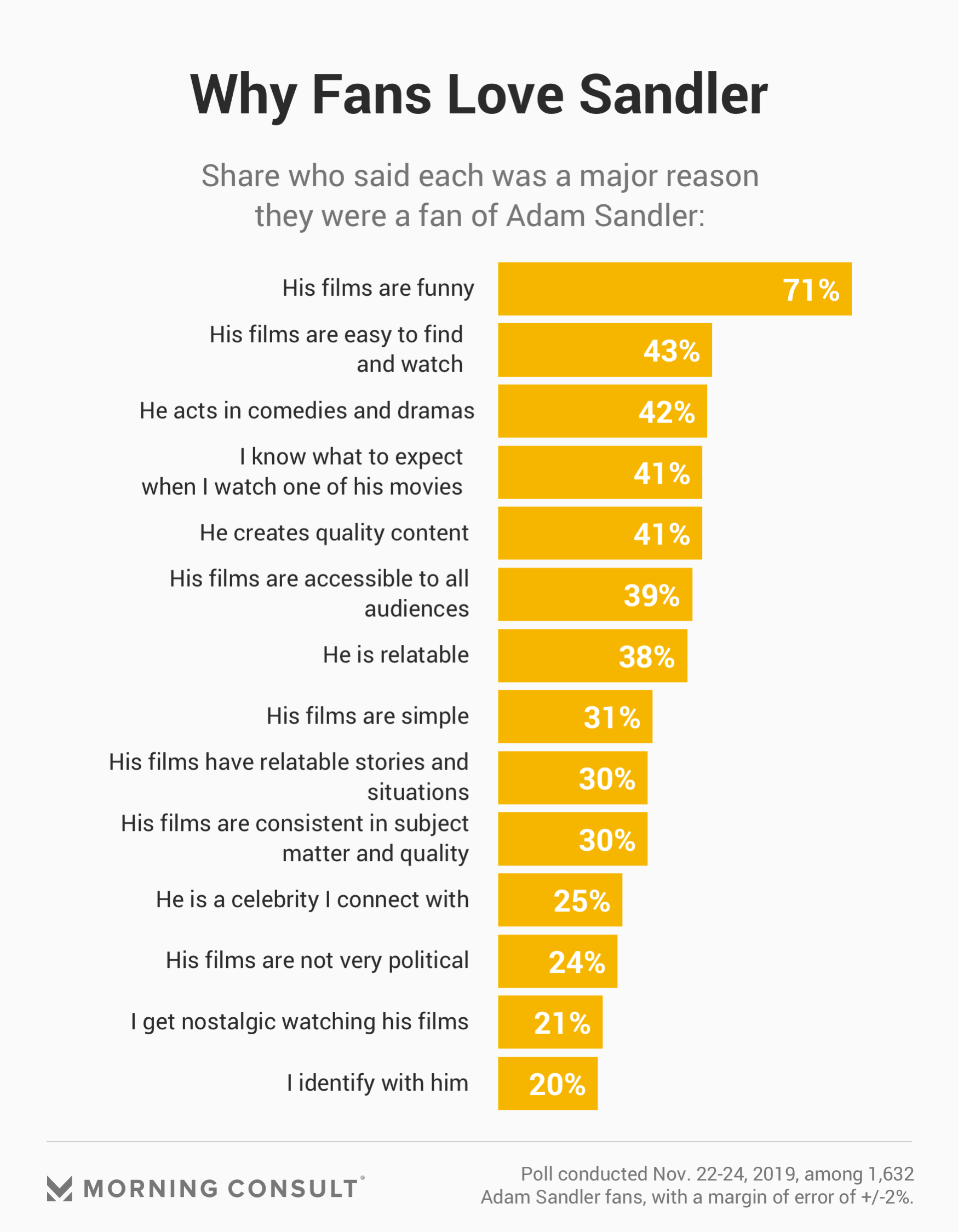 Seventy-one percent of fans cited the humor of his films as a major reason they liked the comedian. Thirty-eight percent said they were fans because they found Sandler relatable, while 41 percent said they liked him because they know what they could expect from a Sandler film.