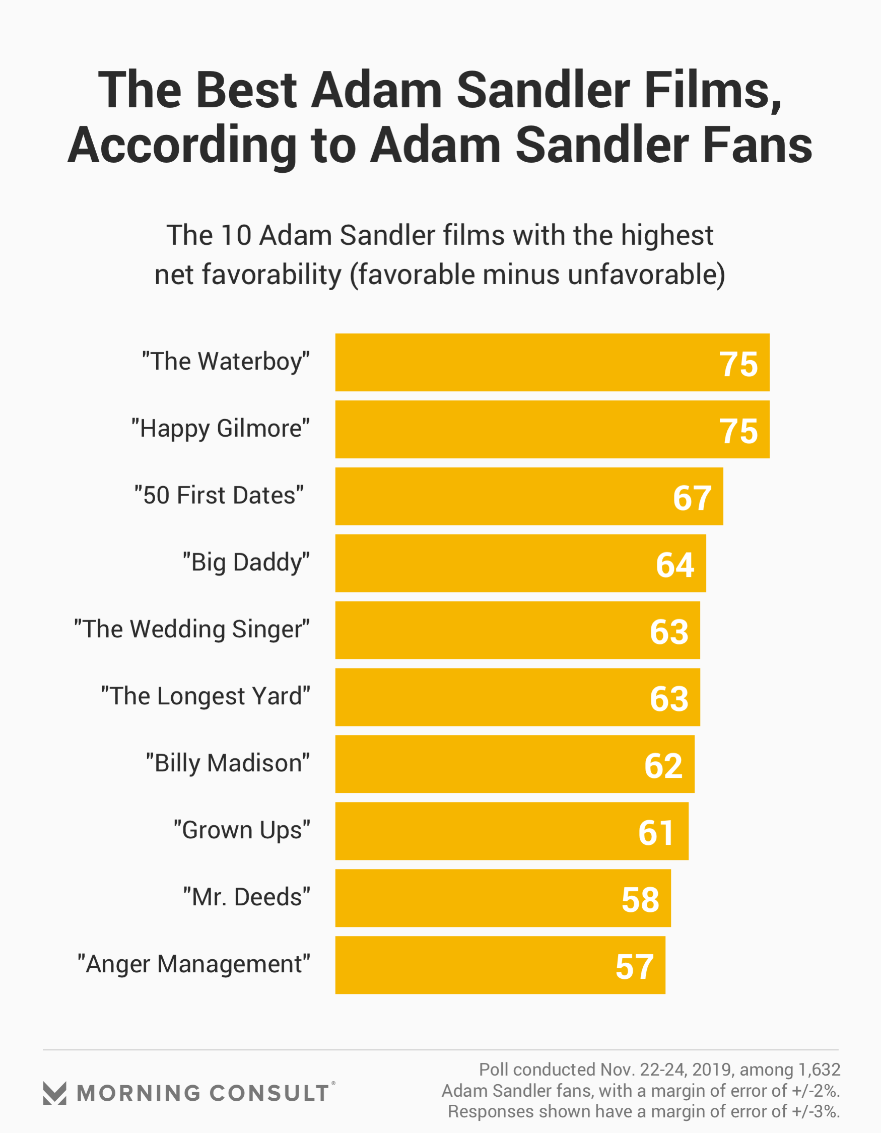 Survey respondents who described themselves as fans were presented with a list of Sandler’s films and asked their opinion of each movie, with the samples split roughly in half. “The Waterboy” and “Happy Gilmore” had the highest net favorability -- the share with a favorable view minus those with an unfavorable view -- at 75 percentage points each. Fans were not as familiar with some of Sandler’s more critically acclaimed work, including “Punch-Drunk Love” and “The Meyerowitz Stories,” which most fans said they had not seen.