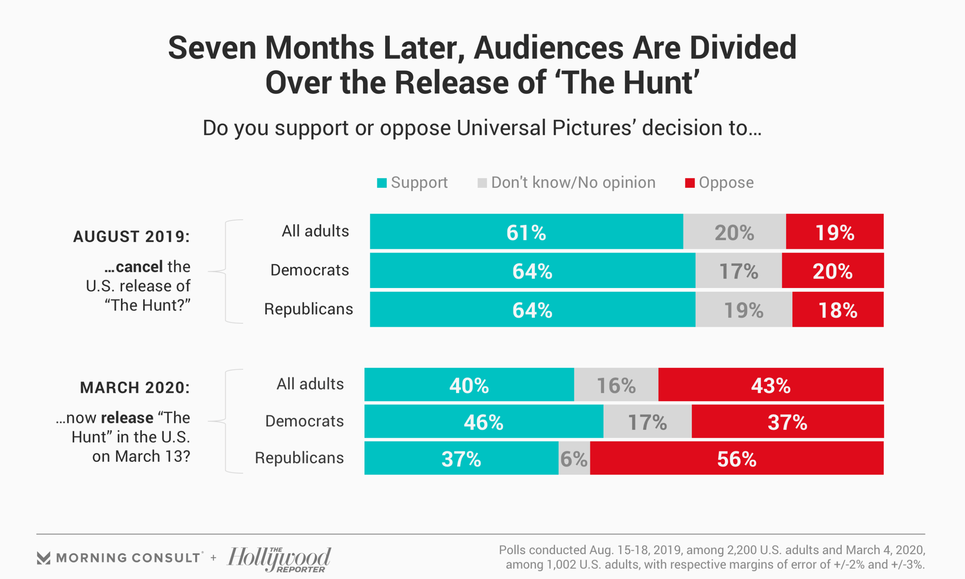 A March 4 Morning Consult survey of 1,002 adults found that the public is split, 40 percent to 43 percent, on Universal’s decision to release the film after viewing the movie trailer. That’s a change from an Aug. 15-18 Morning Consult/The Hollywood Reporter poll of 2,200 U.S. adults, where 61 percent of respondents supported Universal’s decision to shelve the film in the wake of mass shootings.