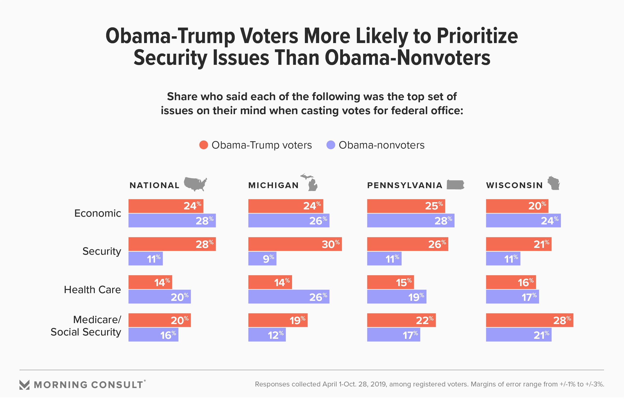 Obama-Trump voters prioritize issues such as border security and terrorism; Obama-nonvoters are more likely to say health care is their top issue.