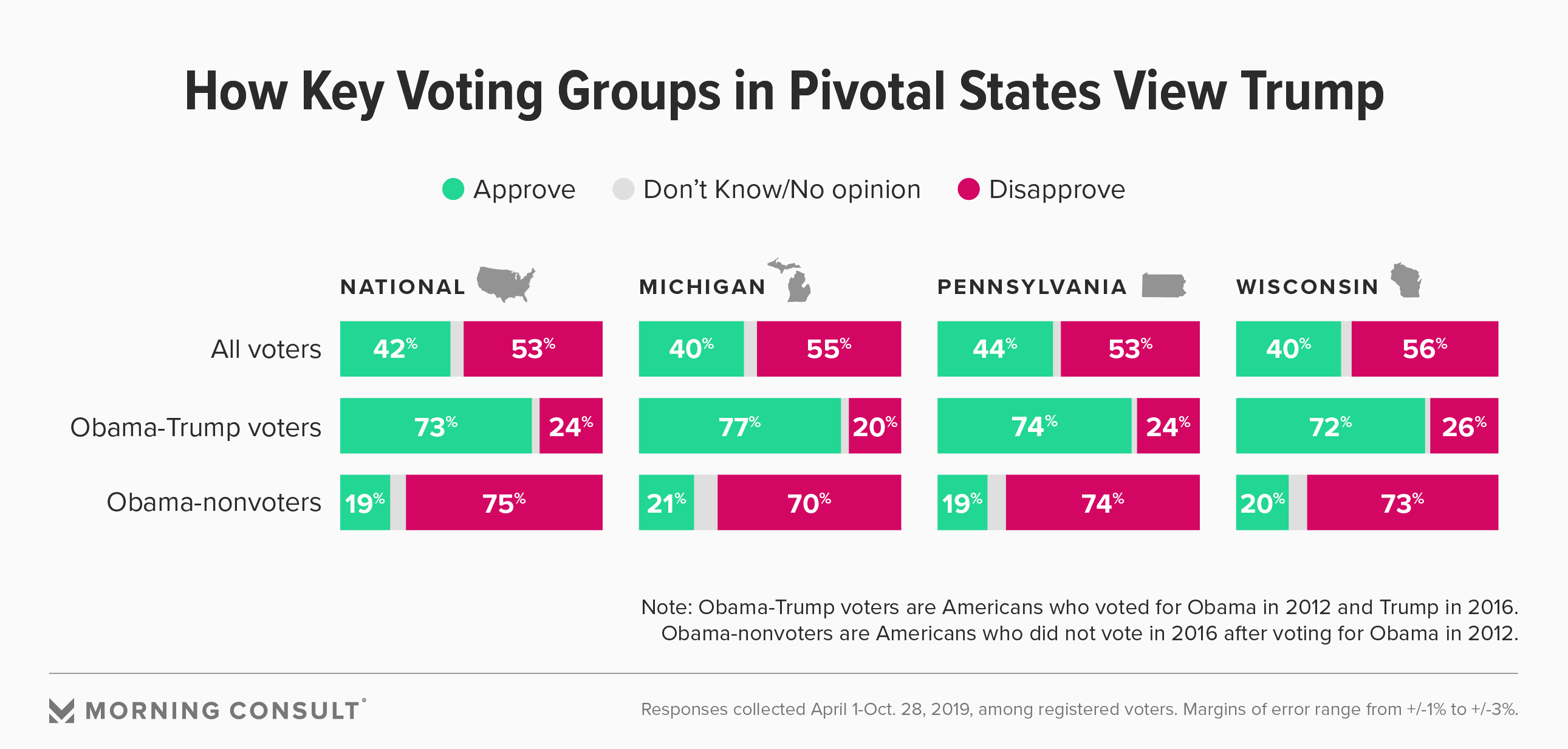 Less than a year out from the 2020 presidential election, a new Morning Consult analysis of more than 132,000 responses collected April 1 through Oct. 28 from registered voters in Michigan, Pennsylvania and Wisconsin finds ample opportunity for Democrats to capitalize on both swing voter groups -- although it’ll require a bifurcated messaging strategy and distinct challenges remain. (You can download the data here.)