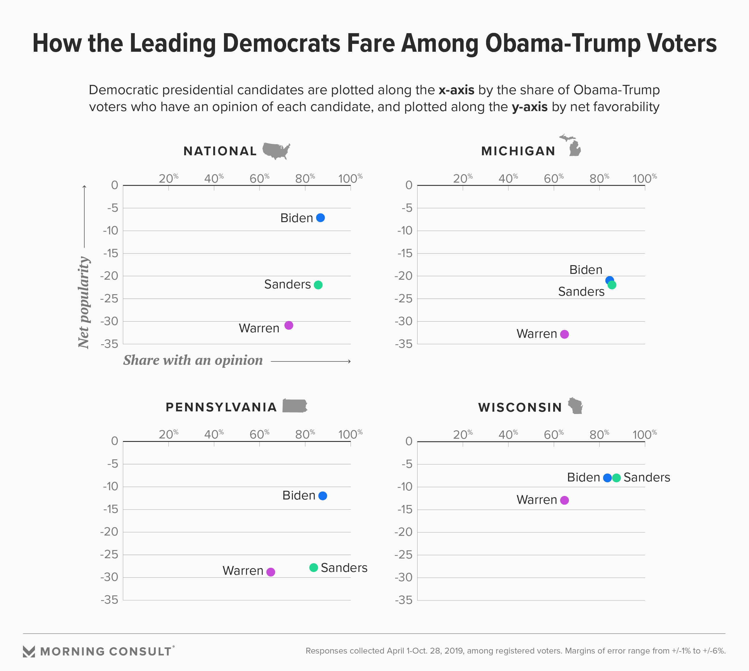 It also could be bad news for Sen. Elizabeth Warren, who fared the worst among Obama-Trump voters in these states. The Massachusetts Democrat, who was in third place in Morning Consult’s latest survey tracking the Democratic presidential race, has lower name recognition than Biden or Sanders, giving her an opportunity to improve her standing as voters become more familiar with her, but the reverse could be true as well.