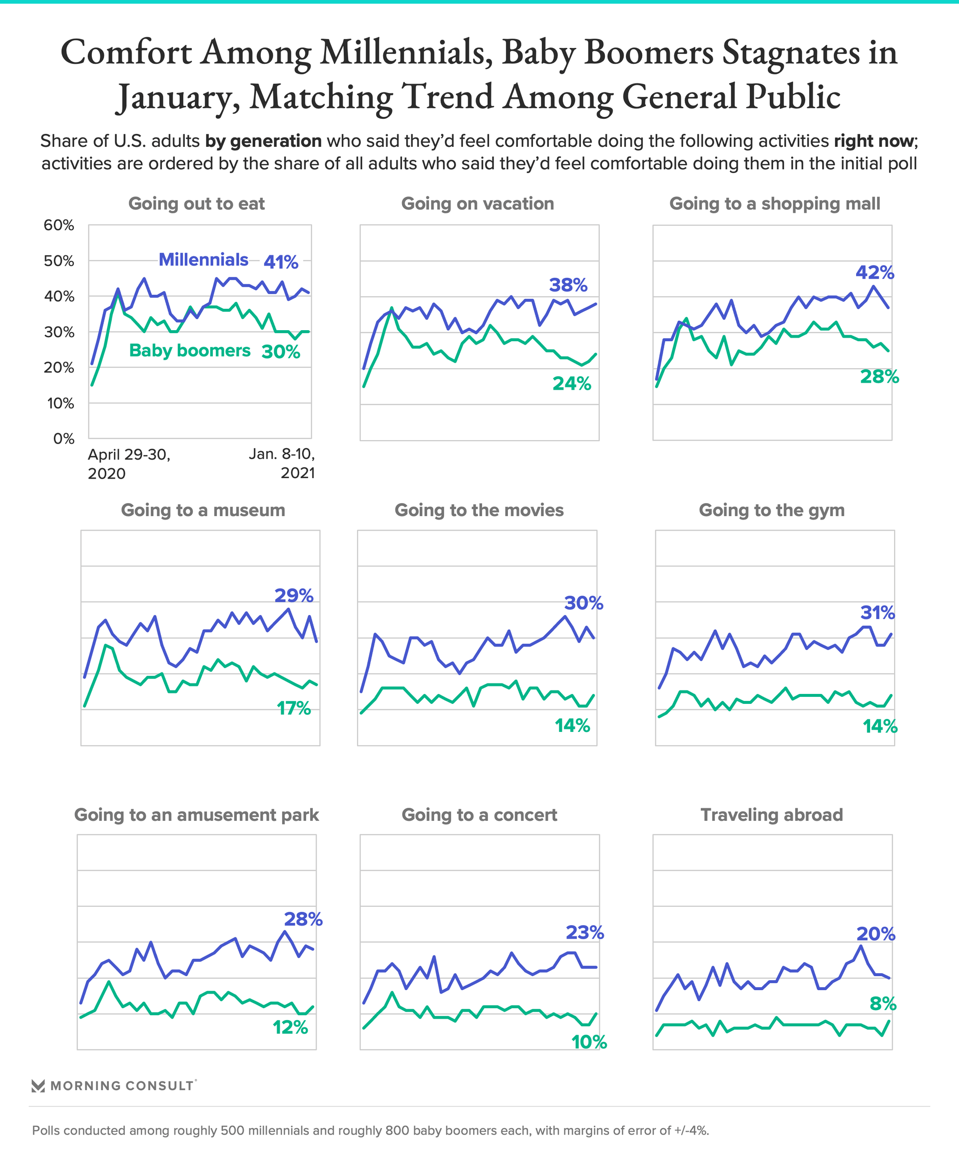 Baby boomers report more slight increases in comfort than millennials, but the younger demographic is still significantly more comfortable across categories.