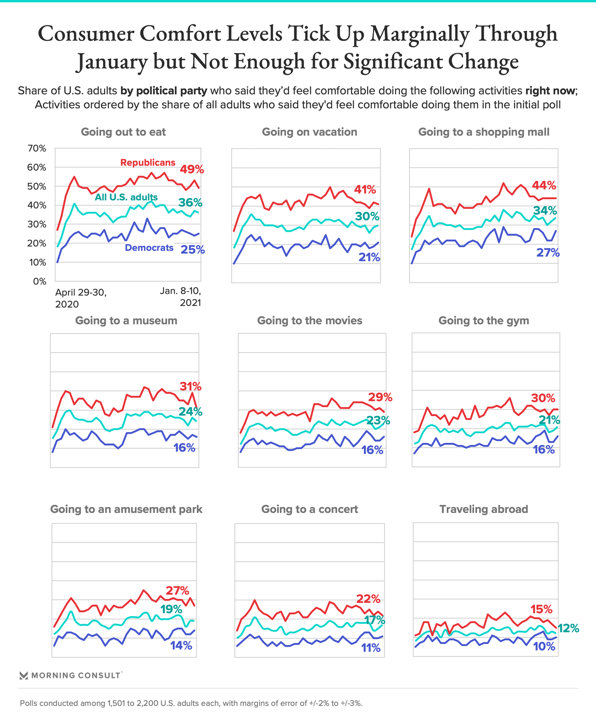 The rest of the activities tracked by Morning Consult followed a similar trajectory. For the majority of the remaining eight categories, comfort levels moved up or down by just 1 or 2 percentage points each, and did not change at all with regard to amusement parks.