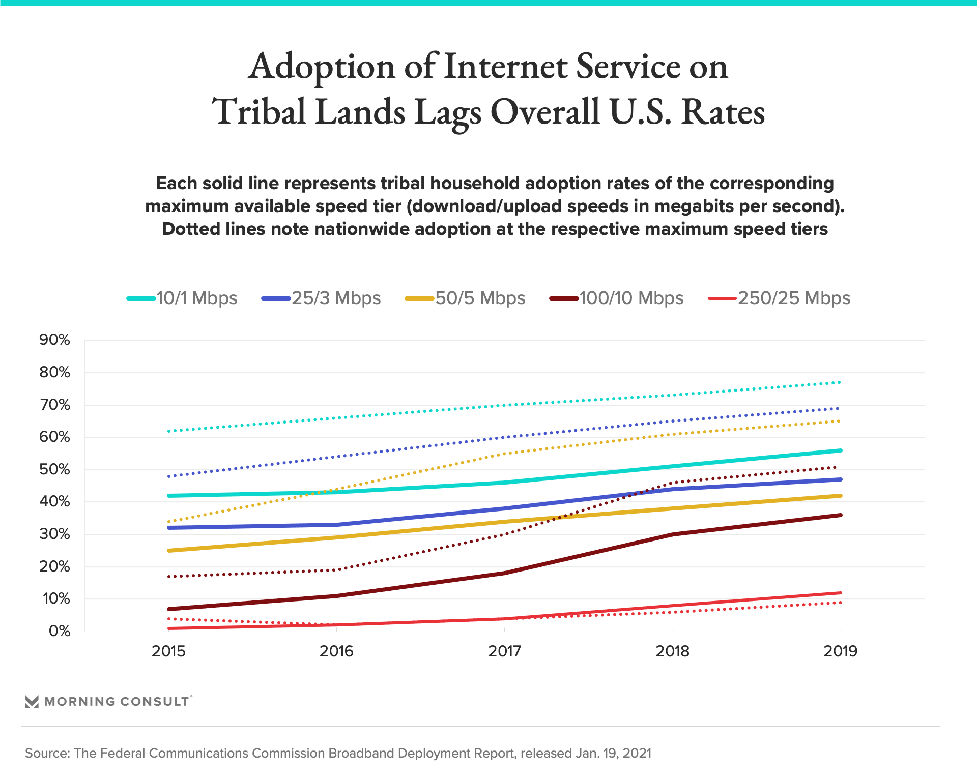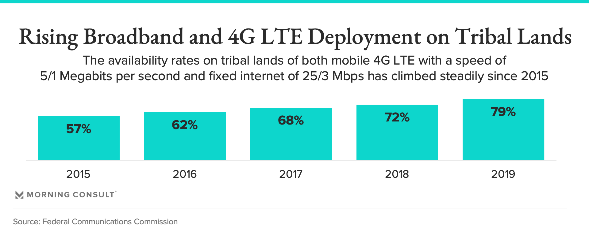 The efforts of Indigenous leaders, like others around the country, come as deployment of fixed and mobile broadband has remained sluggish on tribal lands. As of 2019, only 79 percent of tribal lands had both broadband internet and 4G LTE available, compared to 96 percent of the overall population.