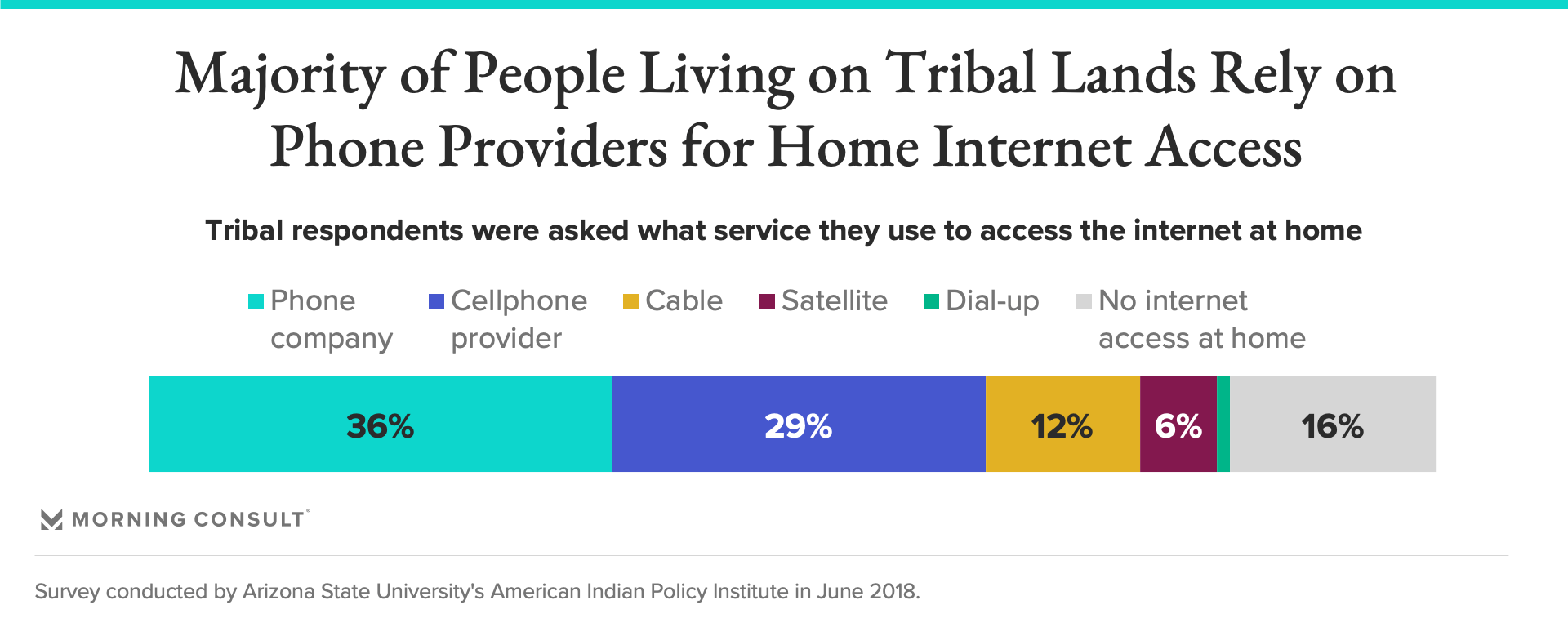 A 2018 American Indian Policy Institute survey found that 36% of those living on tribal lands access the internet through their phone company, compared to just 12% that use cable access, while 1% still use dial-up.