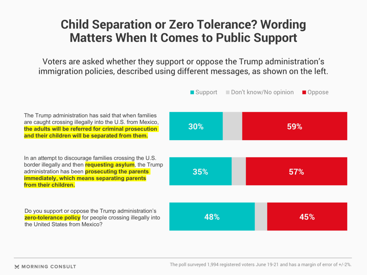 When asked about children being separated from the “people” with whom they came to the United States, 57 percent opposed the policy, while 34 percent supported it. When the word “families” was used instead of people, support fell 4 points, to 30 percent.