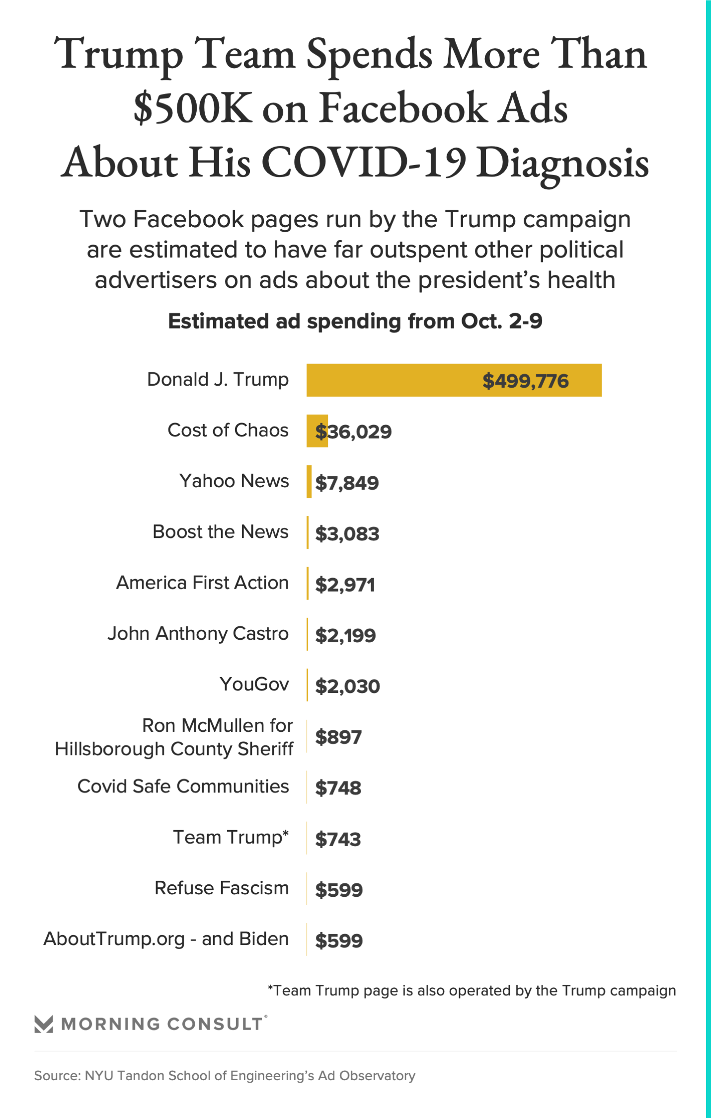 In the days following President Donald Trump’s COVID-19 diagnosis last week, the president’s campaign is estimated to have spent more than $500,000 on Facebook political advertisements discussing his health and treatment plans, far outpacing ad spends by other advocacy groups and campaigns about the same topic, according to data shared exclusively with Morning Consult by researchers at New York University’s Tandon School of Engineering’s Ad Observatory.