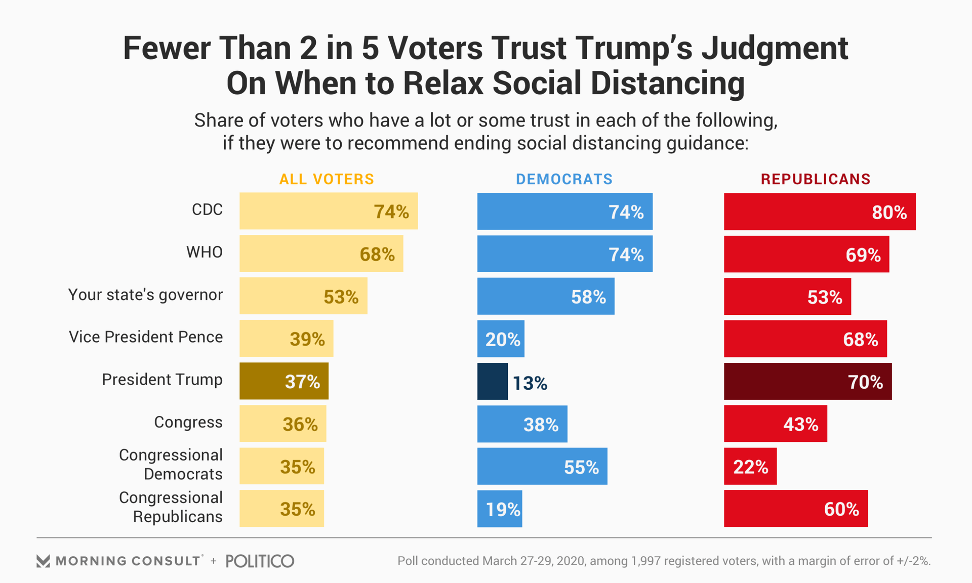 37% of all voters, 13% of Democrats and 70% of Republicans trust Trump on when to relax social distancing guidelines.