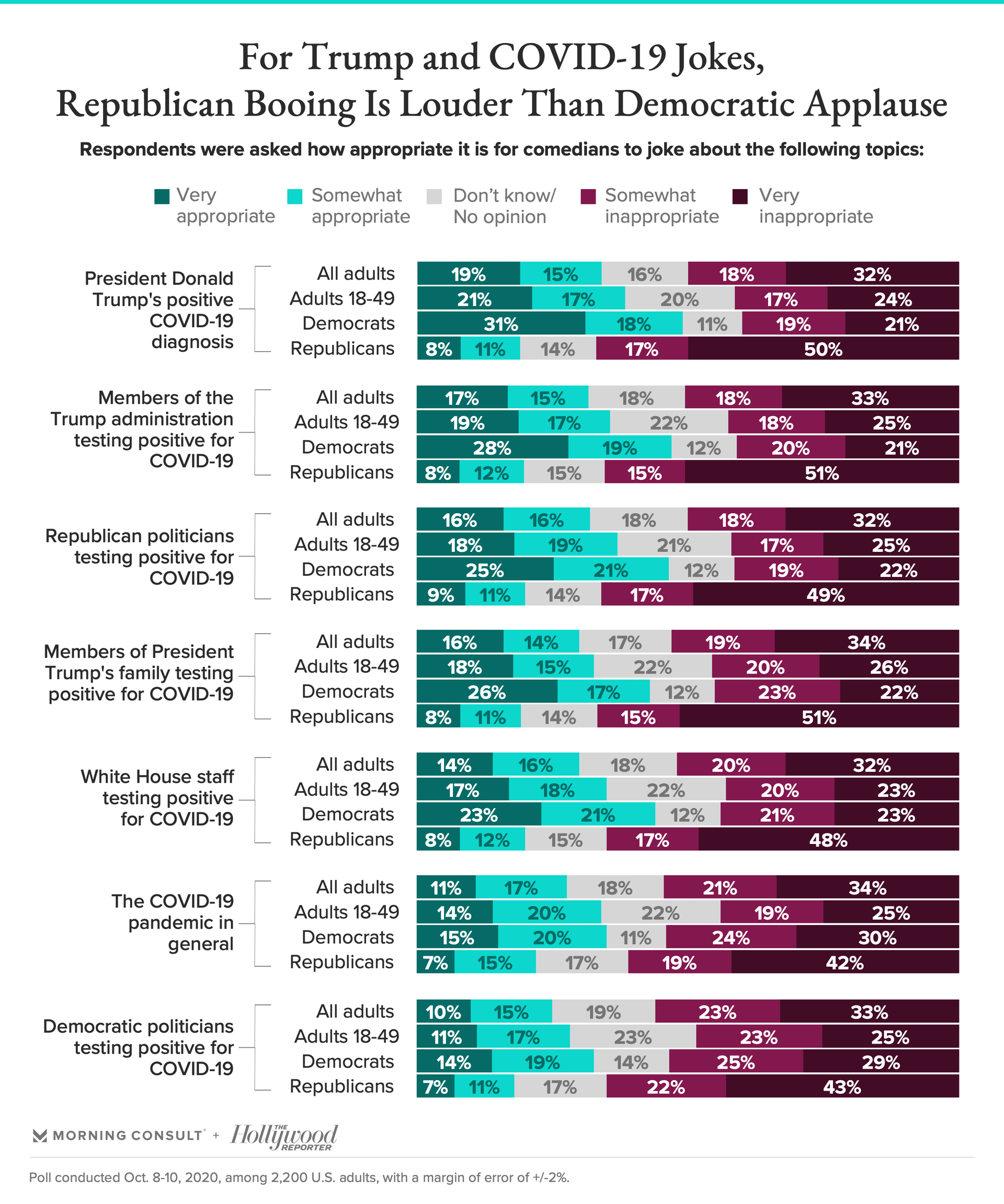 An Oct. 8-10 Morning Consult/The Hollywood Reporter poll found that roughly one-third of the 2,200 U.S. adults surveyed said it was appropriate for late-night shows to make jokes about President Donald Trump’s recent COVID-19 diagnosis, representing a combination of near polar opposite views: 49 percent of Democrats and 19 percent of Republicans said such humor was OK.
