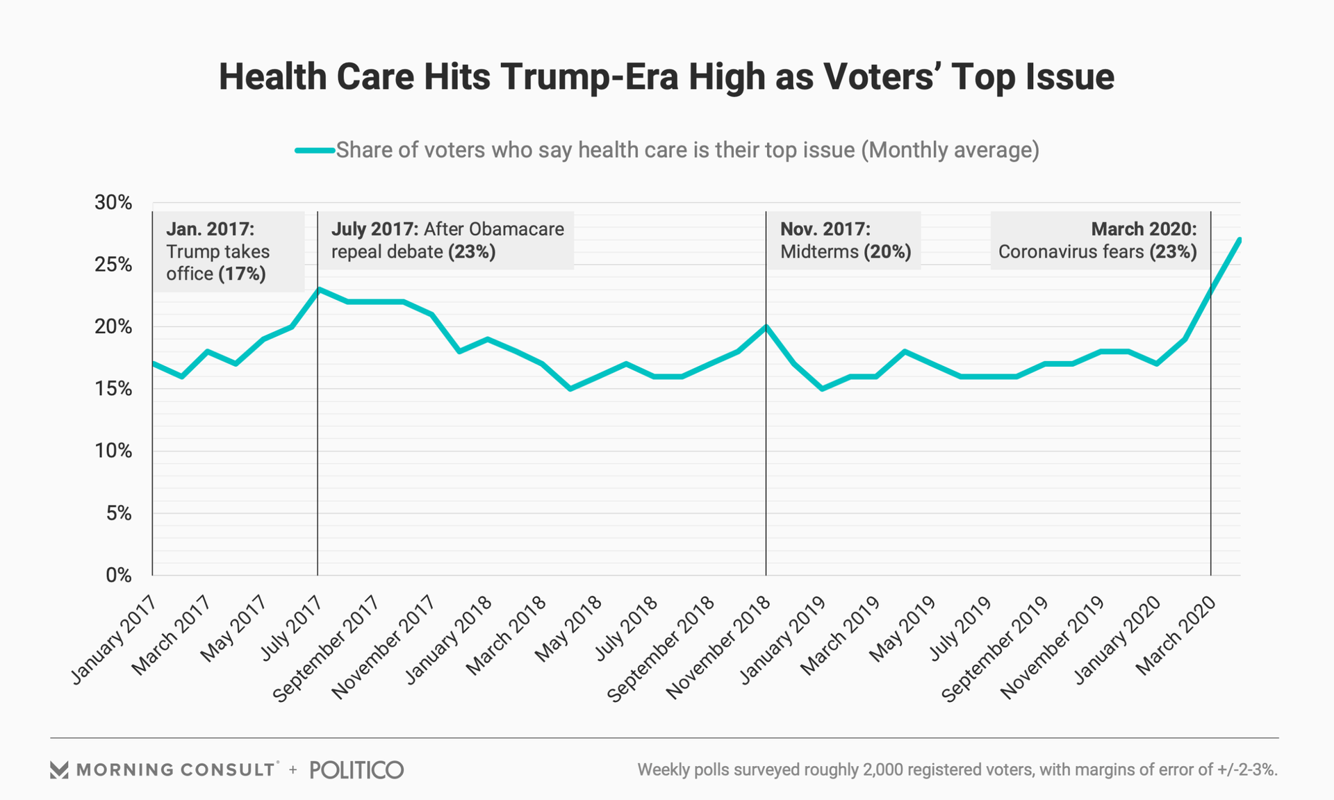 - Health care as a top voting issue hit its highest point since July 2017, when Republicans’ push to overhaul Obamacare failed.