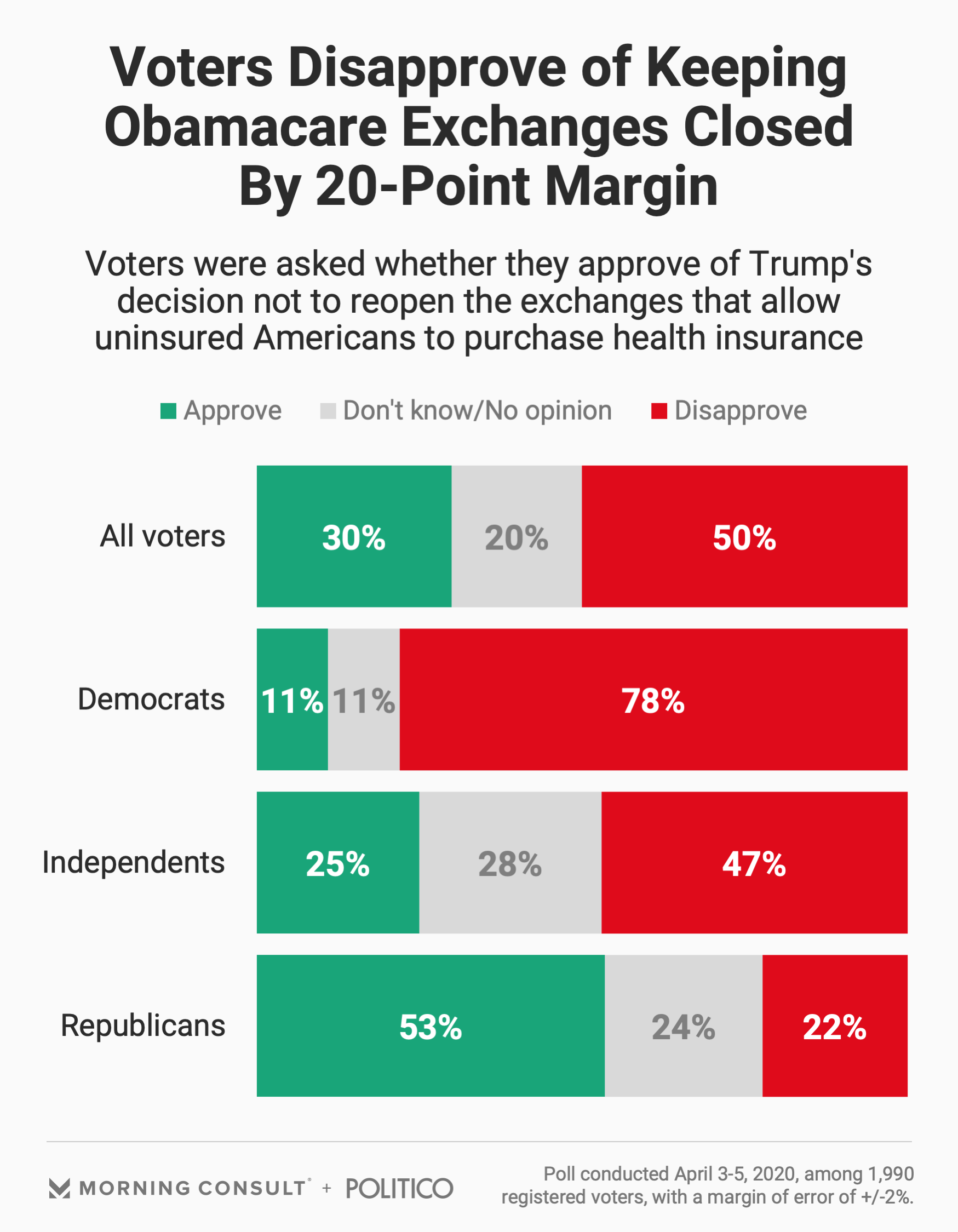 - 50% of voters disapprove of keeping health insurance exchanges closed; 30% approve.