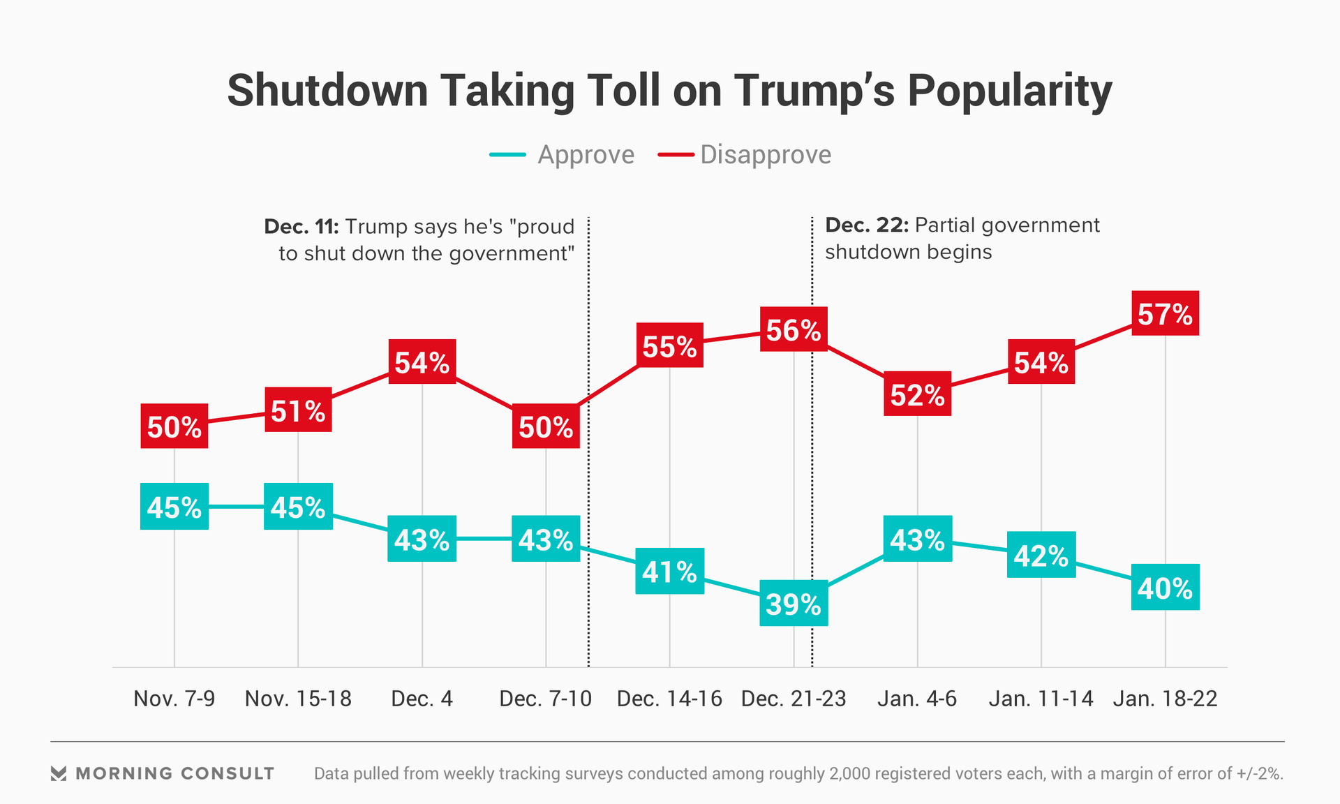 According to the latest Morning Consult/Politico poll, conducted Jan. 18-22, 57 percent of registered voters disapprove of Trump’s job performance -- more than any other survey in Trump’s two years in office -- while 40 percent approve. The 17-percentage-point deficit matches two previous lows of the Trump presidency: in the first weekend of the shutdown, which began on Dec. 22, and in the wake of his comments regarding the fatal riots in Charlottesville, Va., in August 2017.