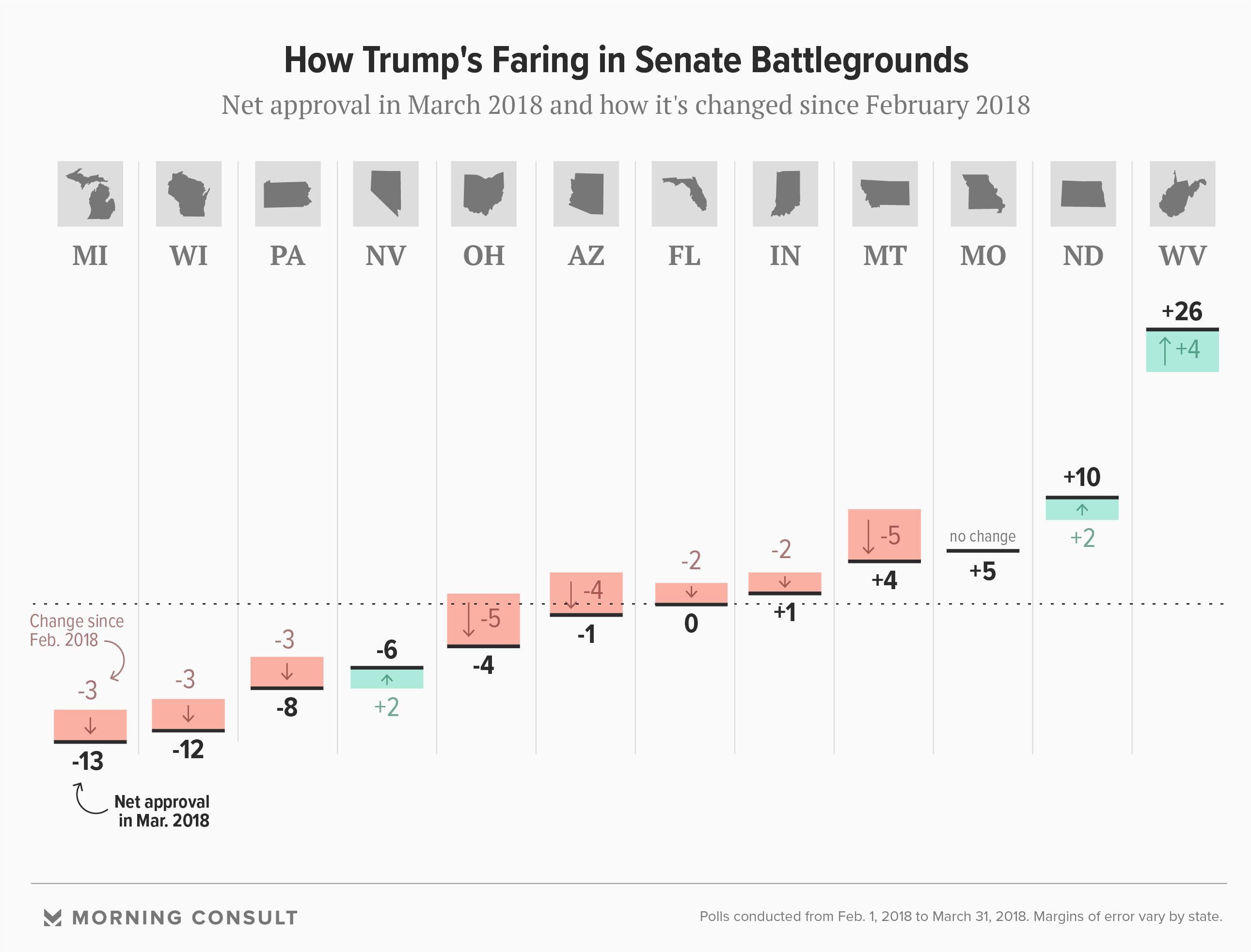 March was also a mixed bag for Republicans, who are trying to retain Senate seats and improve on their 51-49 majority in the chamber. While Trump's approval fell into the red after a 4 point drop in Arizona, where there's an open-seat race to replace retiring Sen. Jeff Flake (R), Trump has pulled to within 6 points of breaking even in neighboring Nevada, where Sen. Dean Heller (R) seeks re-election this fall.