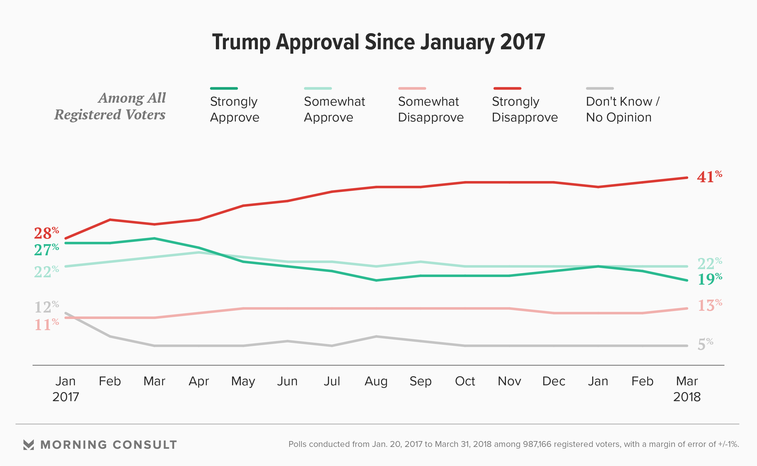 The new data -- compiled from surveys conducted March 1 to March 31 among 97,693 registered voters in every state and Washington, D.C. -- shows 41 percent of registered voters approving and 54 percent disapproving of Trump's job performance, surpassing previous monthly lows from October and November, when 42 percent approved and 53 percent took the opposing view. (Methodology for Morning Consult's Tracking Trump feature available here.)