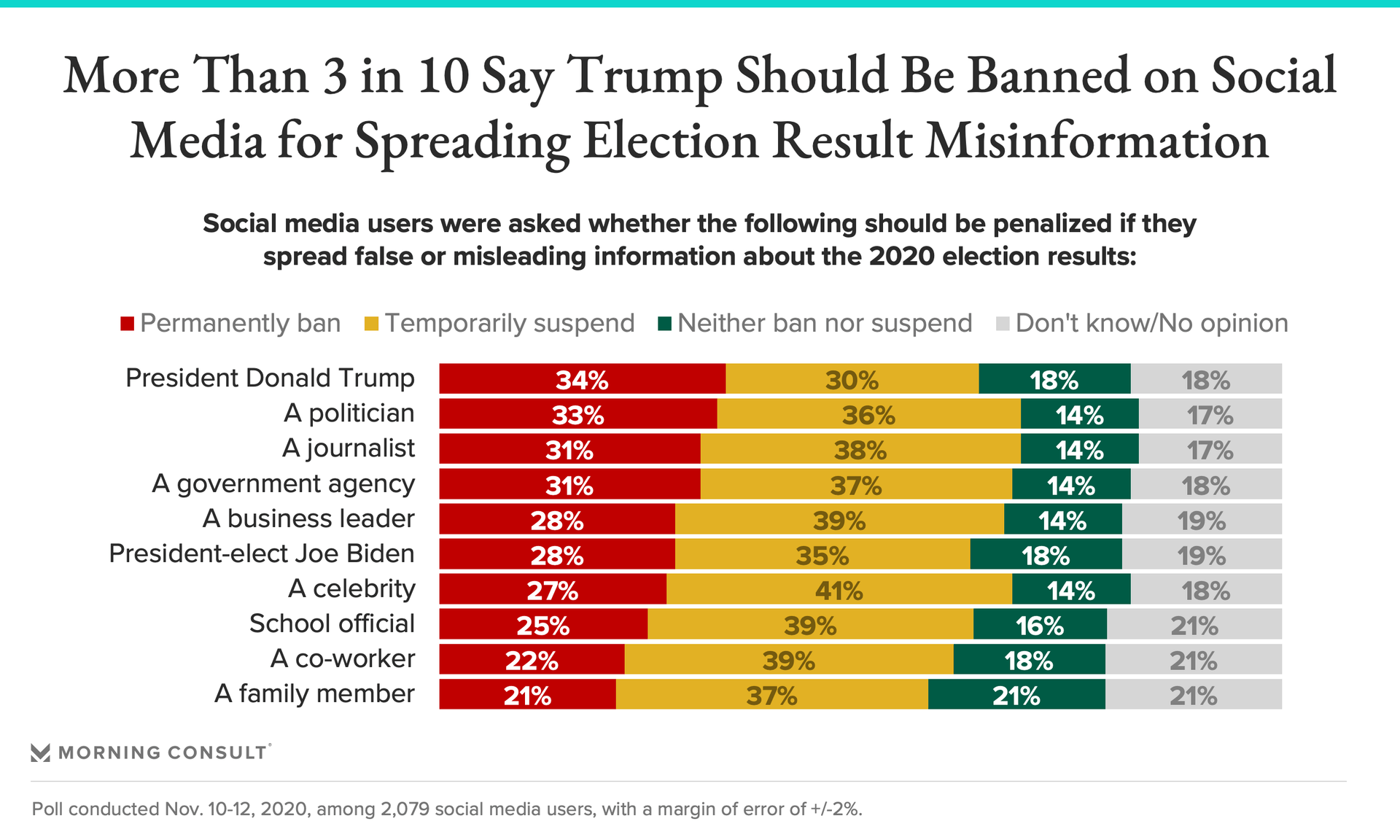 - 34% of social media users said Trump should be banned from platforms whenever he shares disinformation about the election results -- the highest share among the list of figures included in the survey.