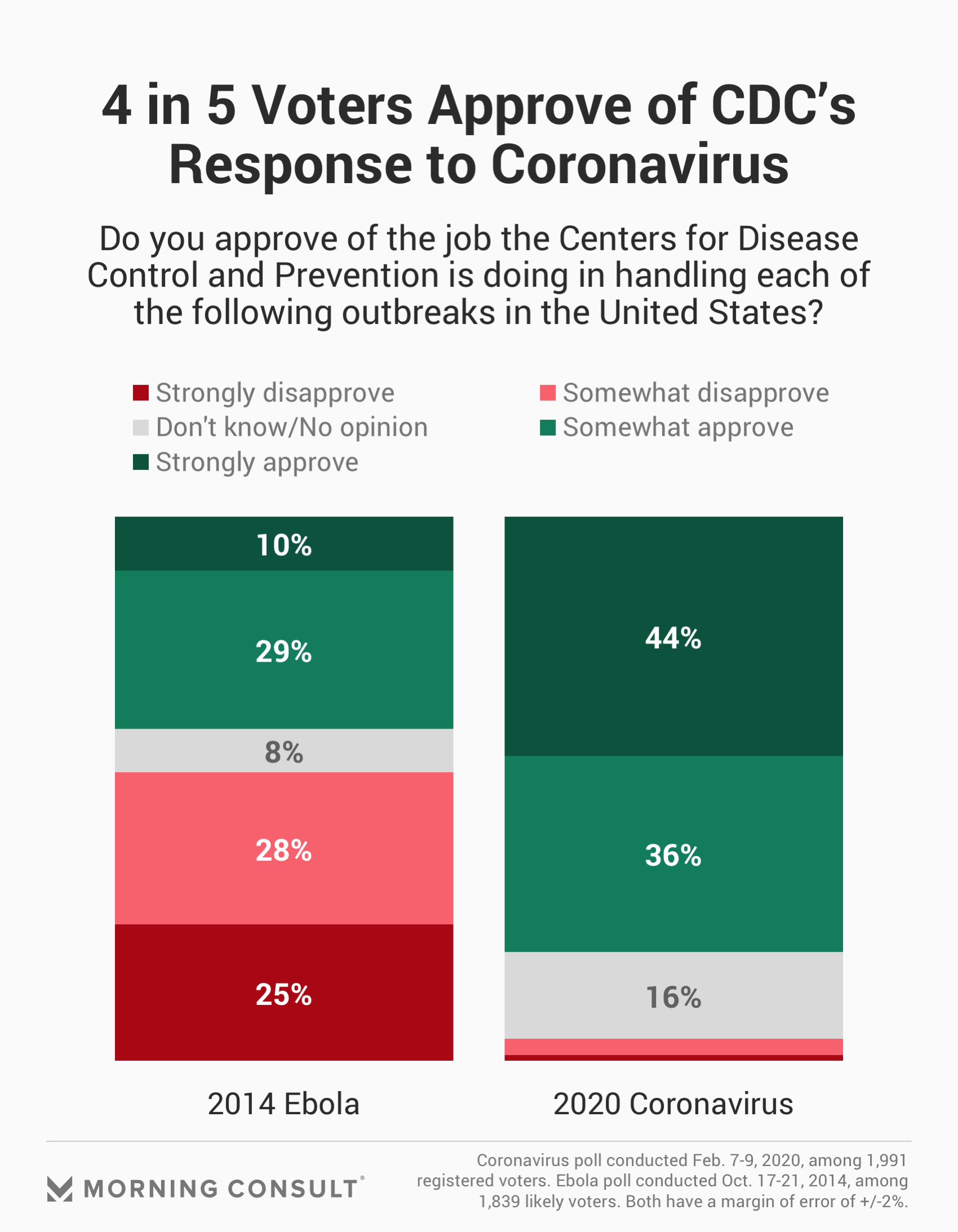In a Morning Consult poll of 1,991 registered voters, 4 in 5 respondents said they approved of how the CDC is handling the spread of coronavirus in the United States, with strong support across all political affiliations. Sixty-one percent approve of President Donald Trump’s response so far, and an equal share believe the U.S. government is doing the right amount to address the outbreak of the coronavirus, while 23 percent say the government could be doing more. The survey was conducted Feb. 7-9 and has a margin of error of 2 percentage points.