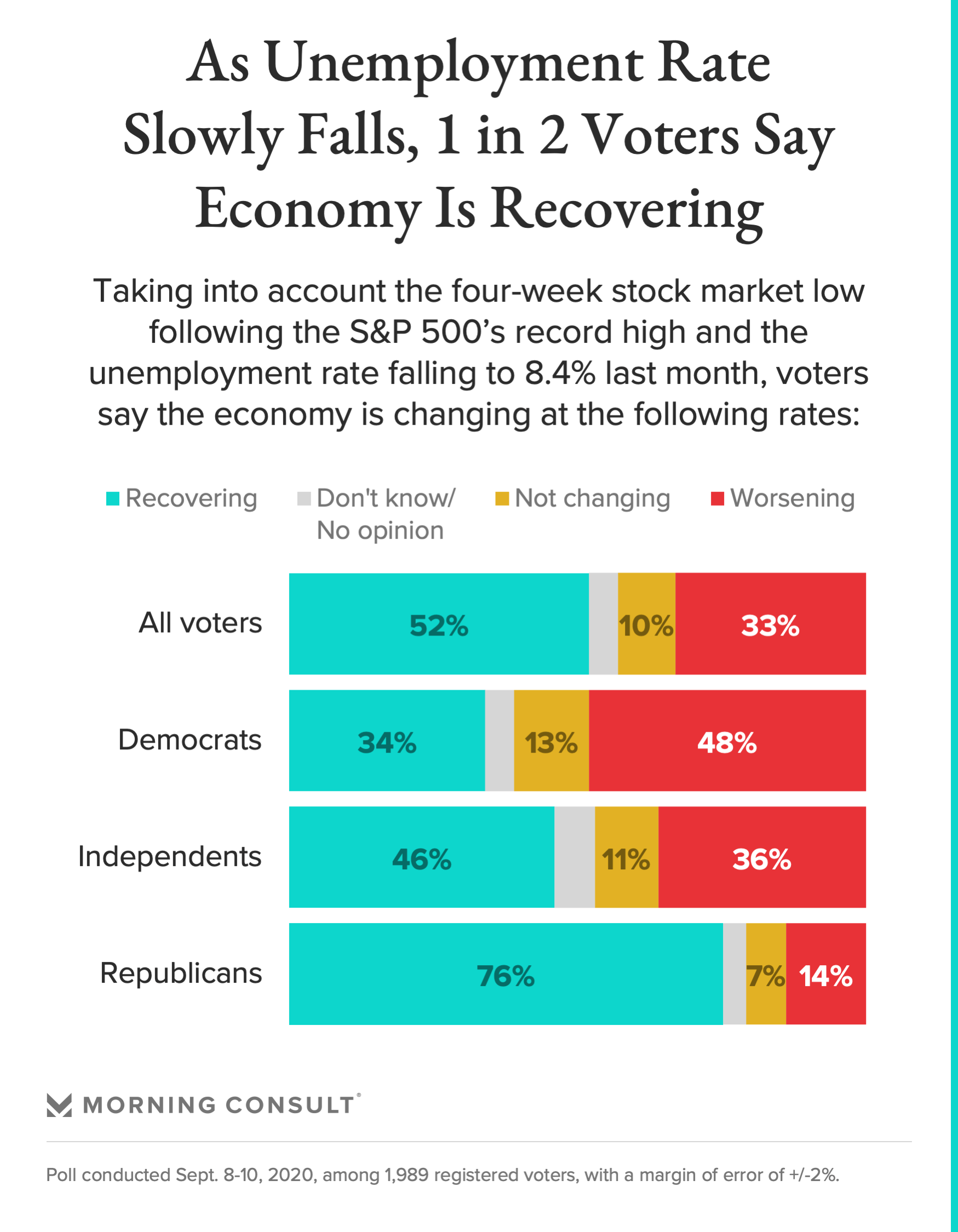 More than half of voters (52 percent) said they would describe the current U.S. economy as “recovering,” compared to 33 percent who said it’s “worsening.”