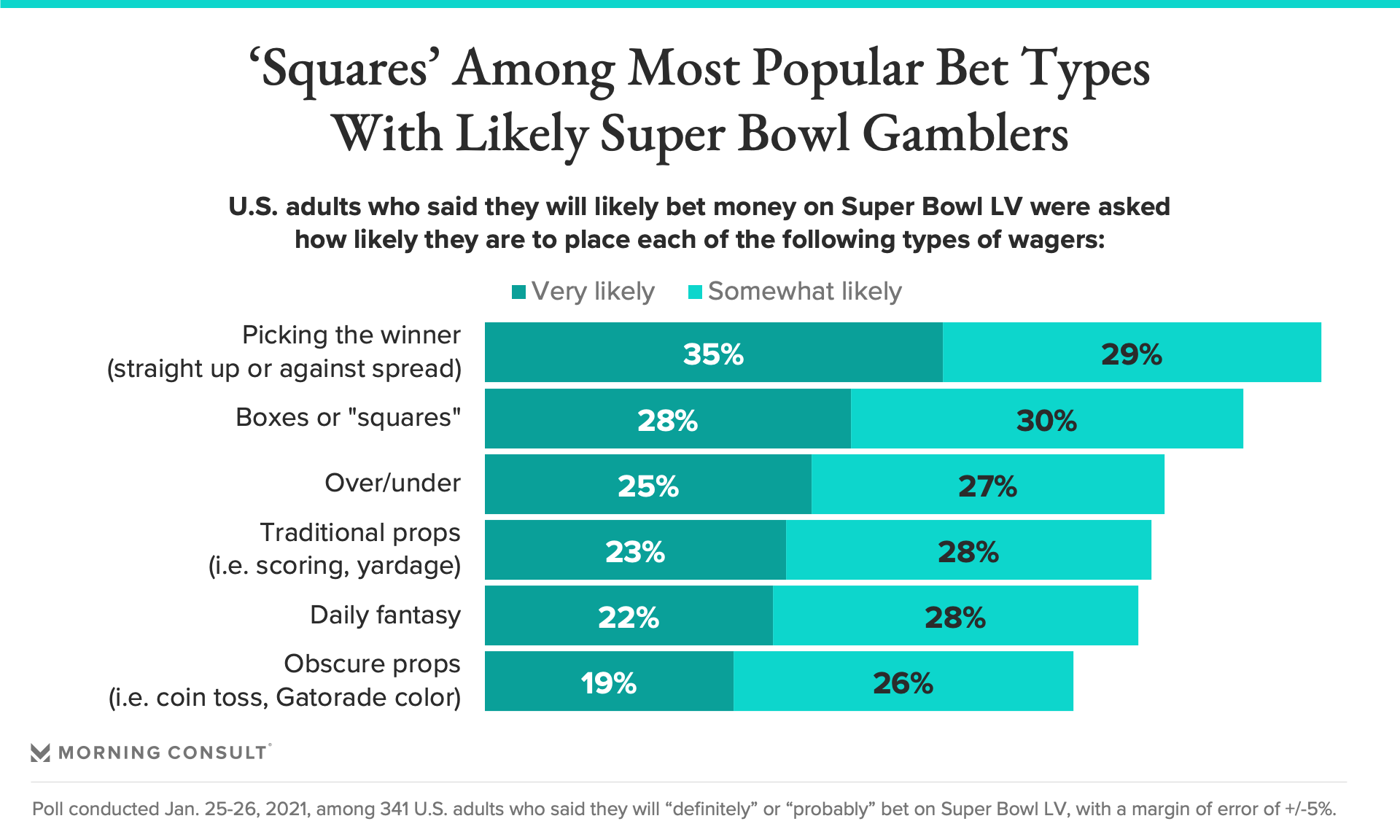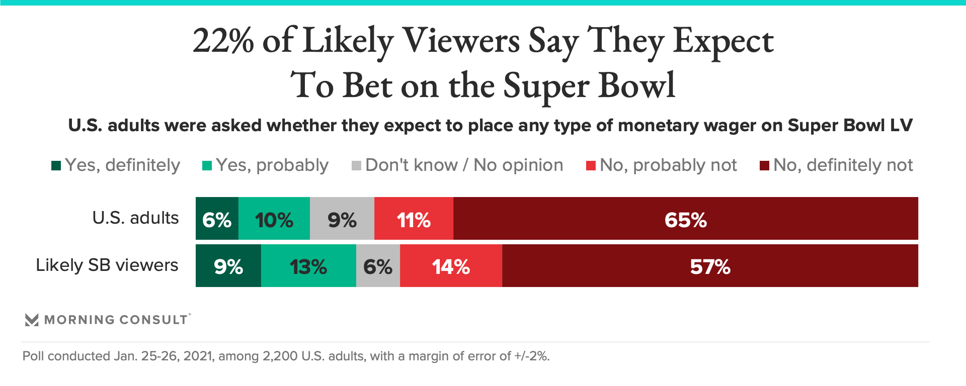 In a poll conducted by Morning Consult, 16 percent of U.S. adults said they plan to place some sort of monetary wager on Sunday’s game between the Kansas City Chiefs and Tampa Bay Buccaneers, whether it be online or mobile, at a brick-and-mortar casino, in a pool with family and friends or in a daily fantasy contest. Among Americans who said they’re likely to watch, roughly 1 in 5 expect to bet on the game.