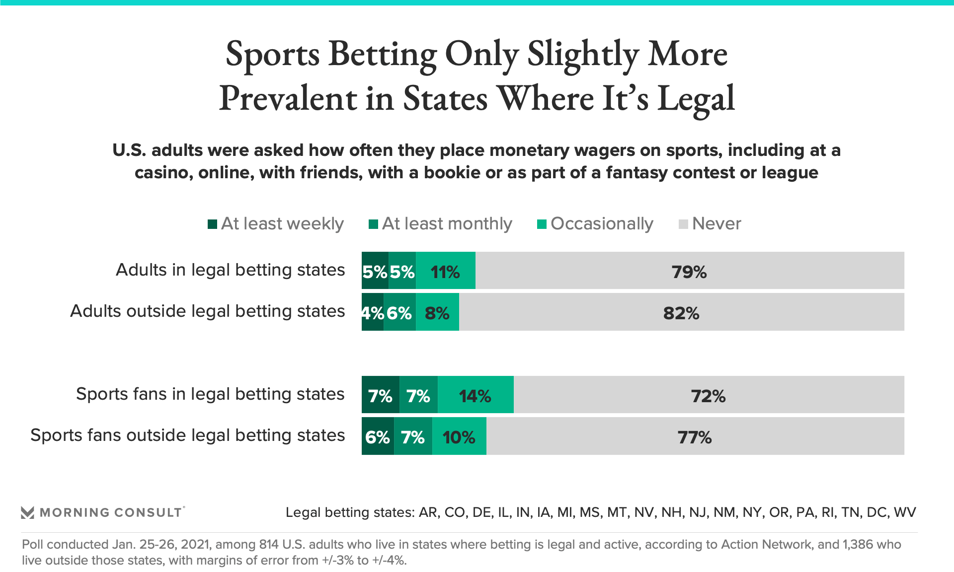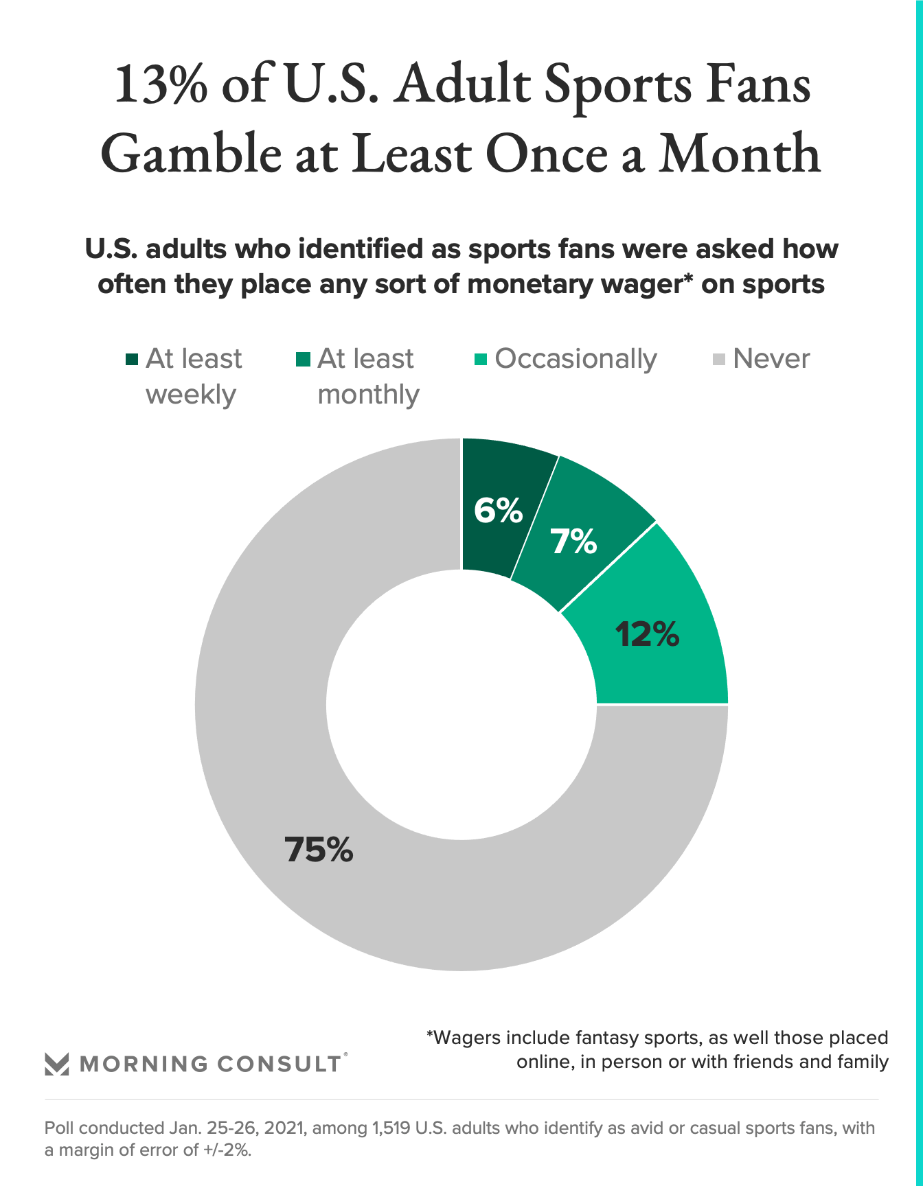 10% of U.S. adults and 13% of adult sports fans place monetary wagers at least once a month.