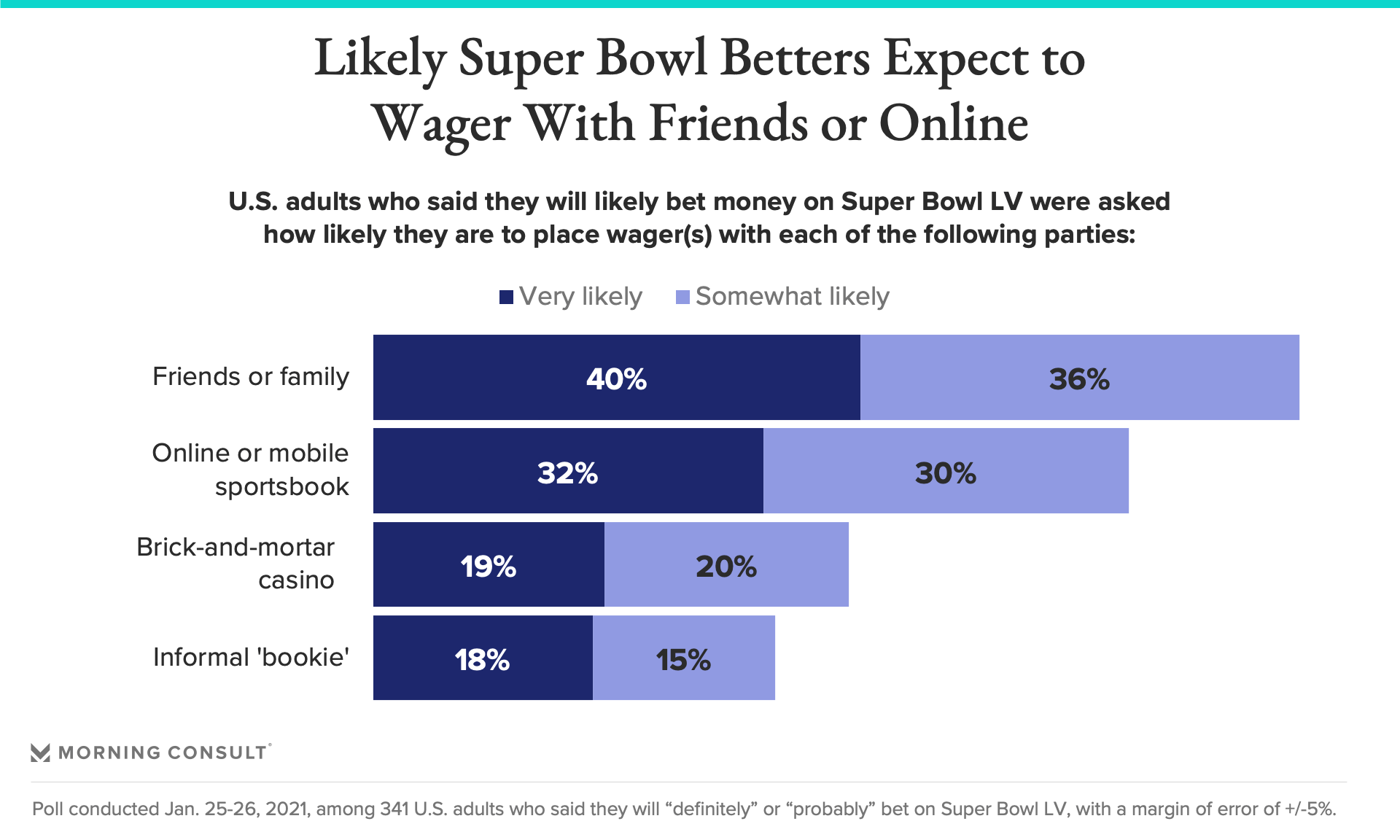 In the Jan. 25-26 survey, 76 percent of those who said they expect to bet on Sunday’s game said they were likely to do so with friends and family, while 62 percent said they would bet with an online or mobile sportsbook. Less than 40 percent of likely bettors said they might head to a brick-and-mortar casino to place a bet, while 33 percent will bet via an informal “bookie.”