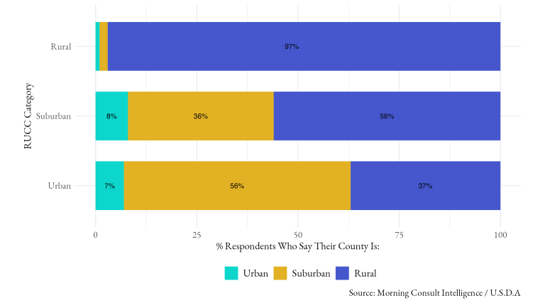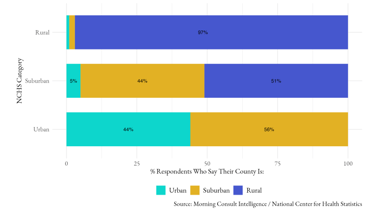Some projects are benefitted by relying on administrative characterizations of communities because they are concerned with the same factors that underpin government definitions, like labor exchanges between centers and peripheries. Yet others, especially those concerned with public opinion and relating residence types to attitudes, would be well-served to take heed of people’s own perceptions of where they live. Morning Consult is uniquely positioned to provide insight into public views of urbanity and rurality by virtue of the unprecedented scale on which we collect data. Interviewing thousands of people daily across the country means we are able to capture the contours of community perceptions at the county level in a way that smaller scale efforts cannot.
