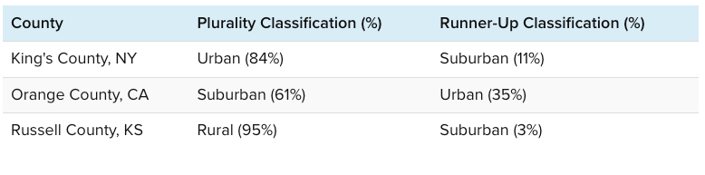 Most polling cannot use public opinion to classify geographies more granular than the state level because of insufficient sample sizes: states are too heterogeneous to meaningfully classify as “urban” or “rural” and too few people are interviewed to get a good read at a level like the county. Morning Consult is able to overcome this limitation because of the unique scale of our data collection. Using respondents’ geographic information and self-reports of living in an urban, suburban, or rural area from 2020 to 2023, we generate over 5 million observations covering 99% of U.S. counties. We only retain data for counties where we observe 50 or more respondents, in order to get a reasonable read on public perceptions (ultimately covering 90% of counties). The decision rule we use to classify whether a county is urban, suburban, or rural, is a simple plurality: whatever a plurality of respondents in a county say that county is, that is how we classify it.¹ Some counties are very obviously urban (no one in our data thinks the county covering Manhattan is anything but urban) and some are very obviously rural. But we also recorded the second-most-selected classification and the proportion of people that chose it to capture intra-county variations in urbanity and the (un)certainty around plurality designations. Table 1 is an example of three counties – how the plurality classified them, by what margin, and what the runner-up was.