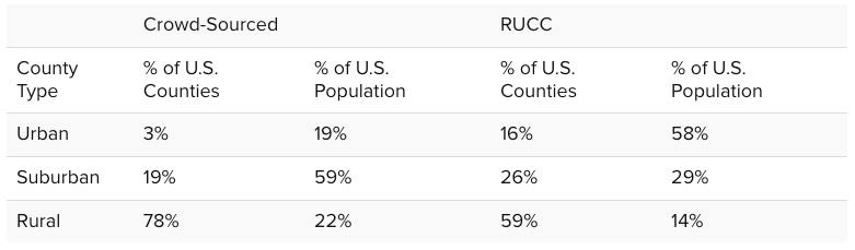 How does this all square with the distribution of counties and populations across these classifications? In Table 2, we report the proportion of counties our respondents classify as being urban, rural, and suburban, and the proportion of counties RUCC classifies as such. We also report what proportion of the U.S. population lives in each of category, by classification system (our crowd-sourced one vs. RUCC). Only 3% of U.S. counties would be considered urban if you polled their residents (column 1), while 78% would be considered rural. Meanwhile, RUCC designates 16% of counties as urban, and 59% rural (column 3). A larger gap exists when it comes to considering population proportions, however. According to RUCC, fully 58% of the population is to be found in urban counties (column 2), but only 19% of Americans would consider themselves as living in an urban area (column 4).
