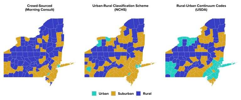 At Morning Consult, we interview around 5,000 Americans every single day. In addition to questions about political leanings and brand preferences, we also ask how people would characterize the area in which they live: is it urban, rural, or suburban? This massive scale of data collection has allowed us to generate a “crowd-sourced” definition of urban, suburban, and rural for nearly every county in the entire United States–a kind of people’s accounting of urbanity country-wide. In this post, we dive into how we did it, what urban/rural looks like according to Americans themselves, and how a crowd-sourced definition differs from (and conforms to) those provided by the administrative bodies on which we often rely.