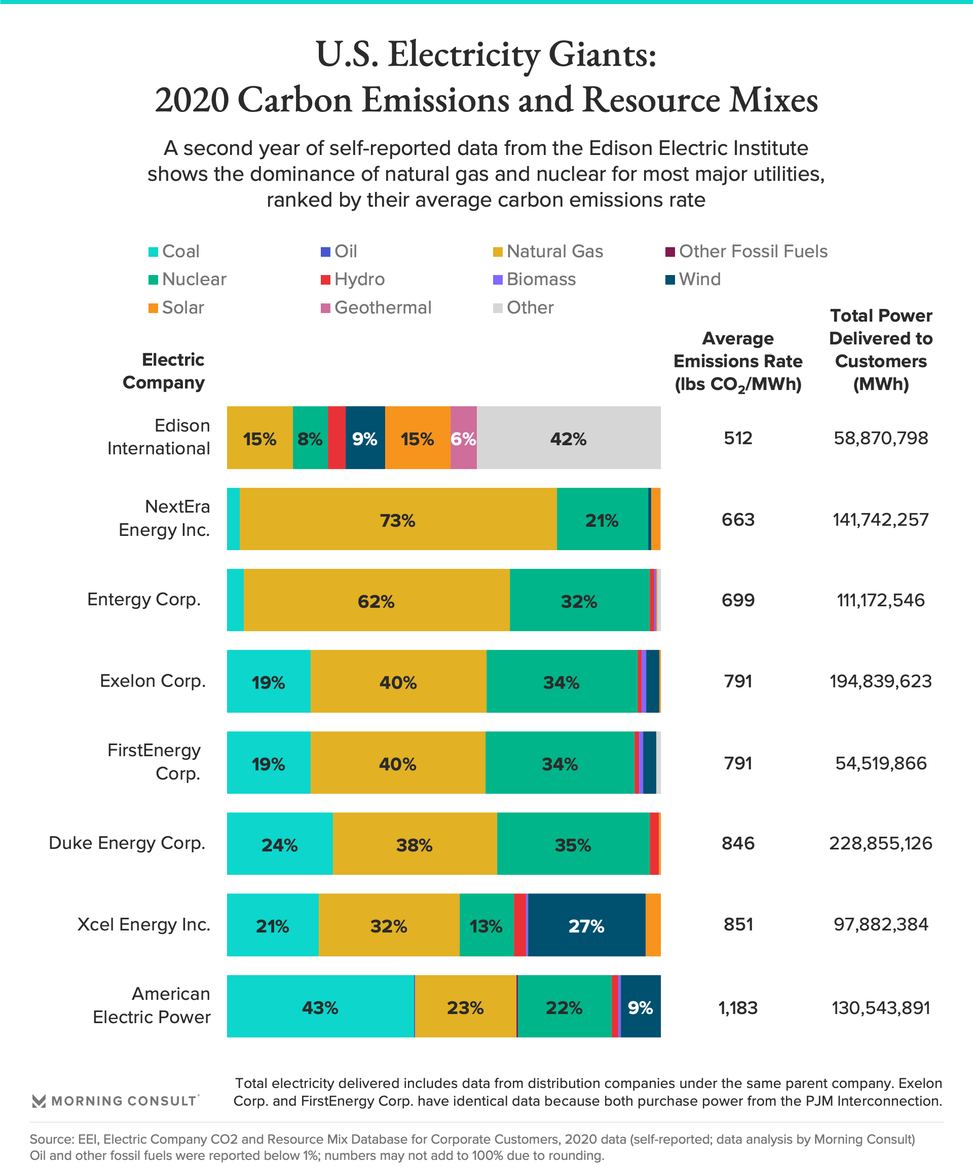 The companies mentioned are among the largest in the country, though they vary widely in terms of how much electricity they deliver to customers (from roughly 55 million MWh to 229 million MWh in 2020) and in terms of geography; some have easier access to renewable or nuclear resources than others.