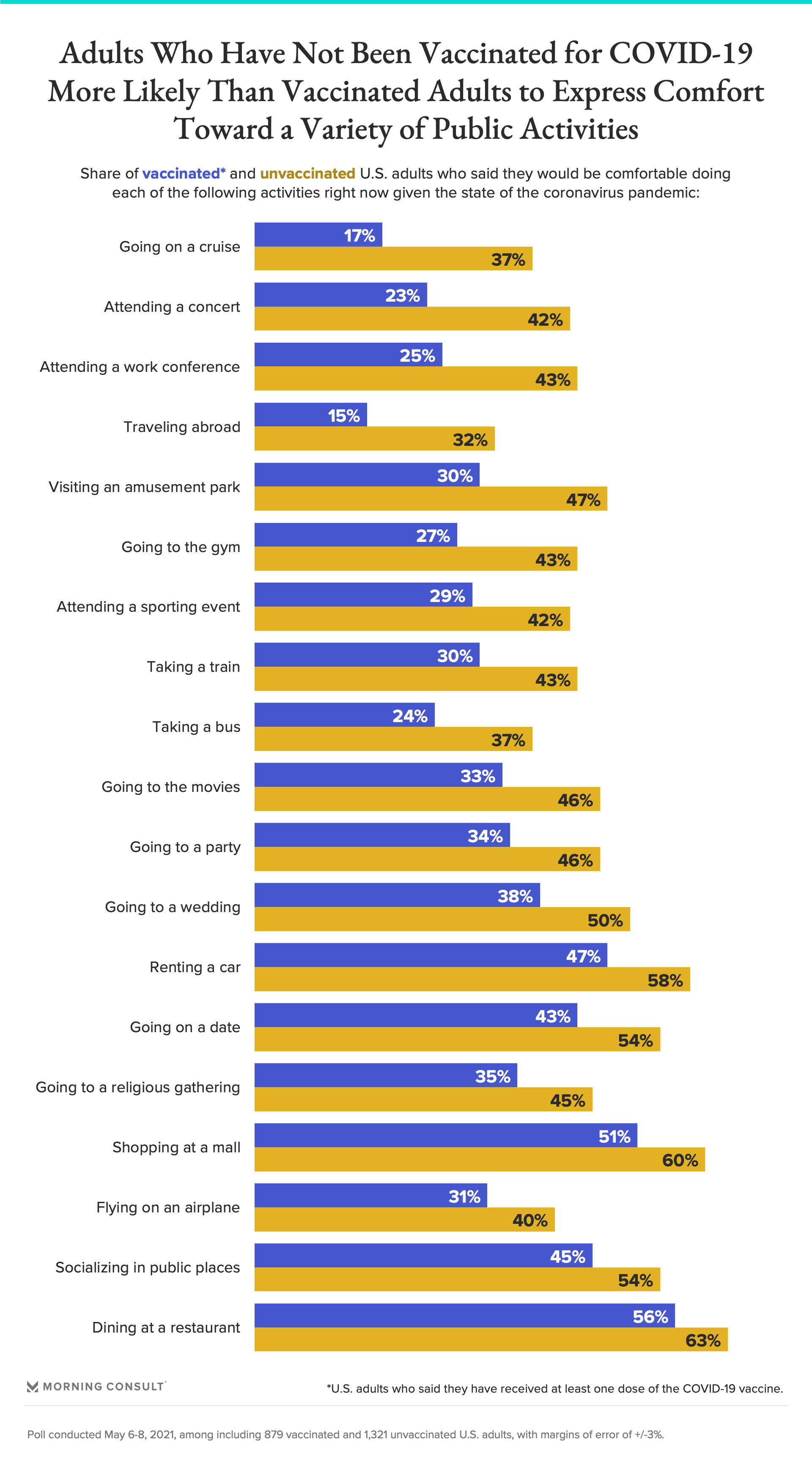 In fact, Morning Consult’s Return to Normal weekly trend data indicates that U.S. adults who have received at least one dose of a COVID-19 vaccine are less likely to feel comfortable doing a wide range of public activities -- from attending a concert to dining in a restaurant -- than their unvaccinated peers.