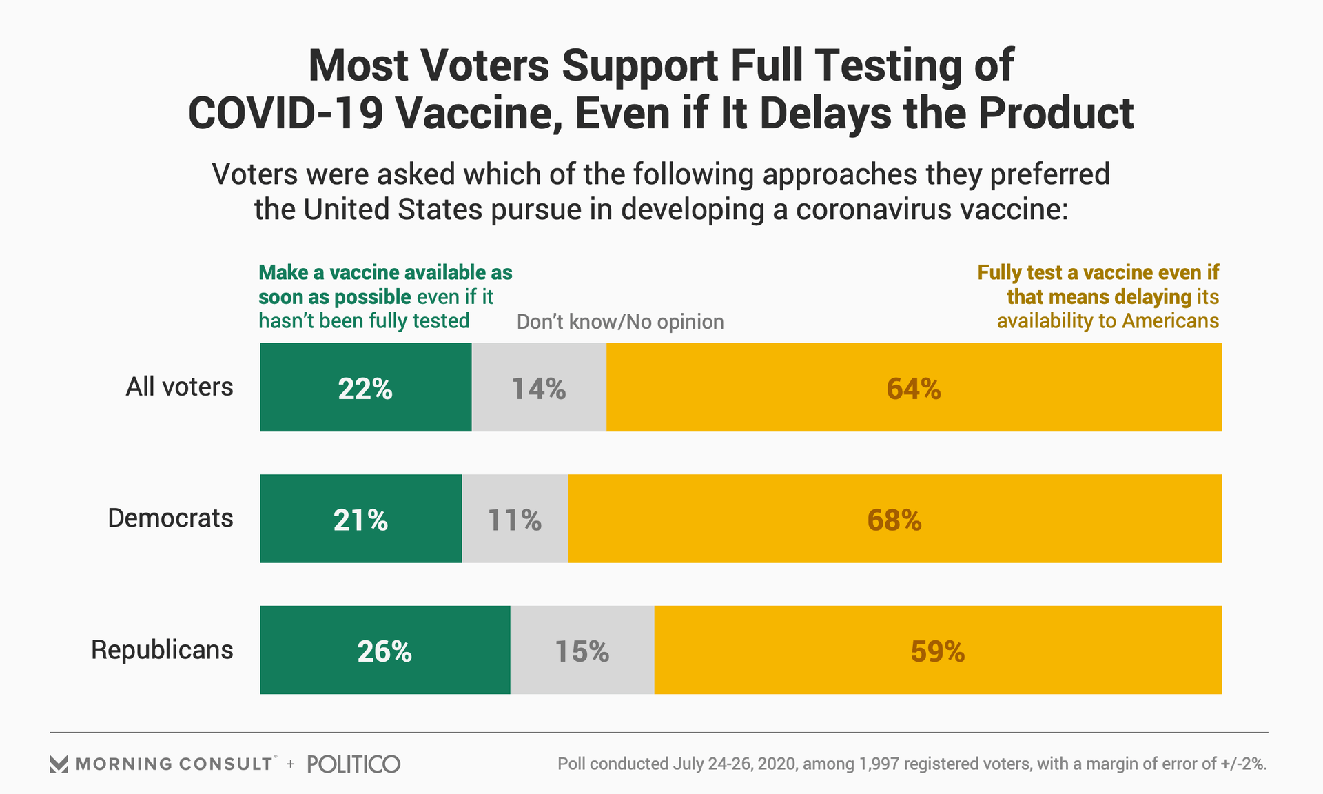 In the survey of 1,997 registered voters, 64 percent said the United States should prioritize fully testing a COVID-19 vaccine even if that means delaying making it available to Americans and the continued spread of the virus. Twenty-two percent of voters said the country should prioritize making a vaccine available as soon as possible, even if it hasn’t been fully tested, to control the coronavirus’s spread.
