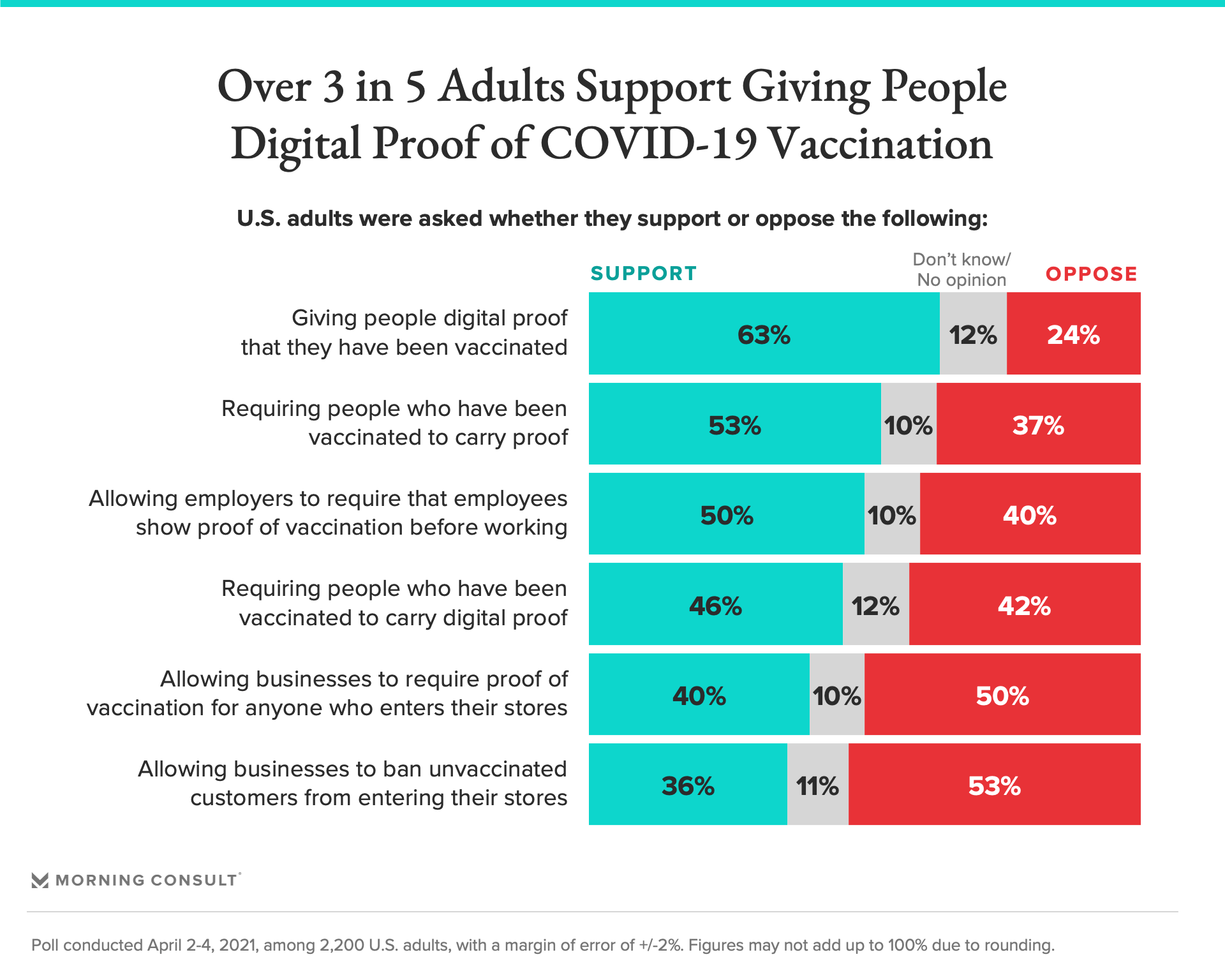 The survey, conducted April 2-4, found that while 63 percent of adults are in favor of giving vaccinated people access to digital proof that they’ve gotten a shot, just 46 percent would support a requirement that vaccinated people carry digital certification with them.