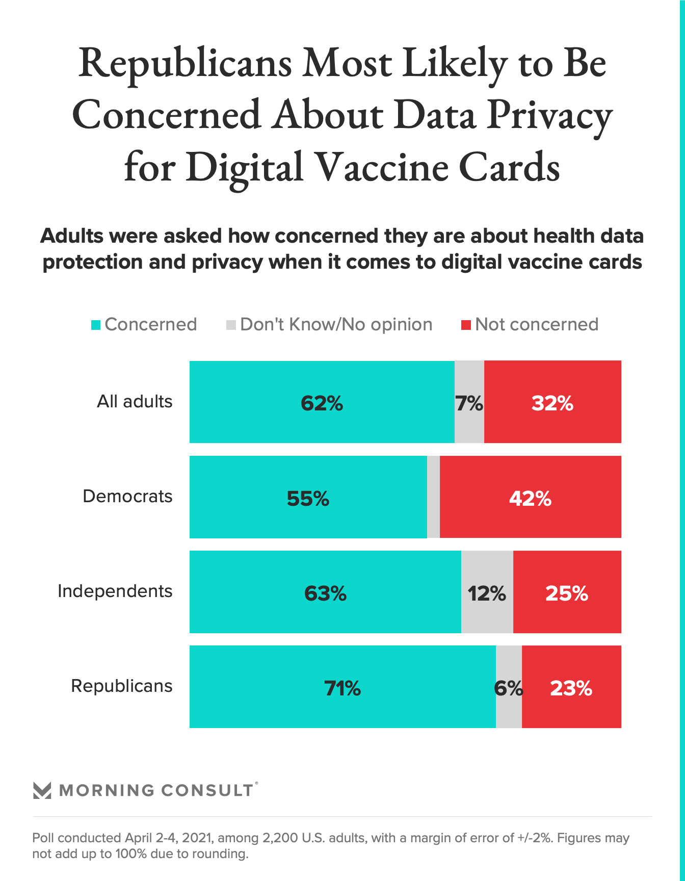 71% of Republicans and 55% of Democrats said they were concerned about health data protection when it comes to digital vaccine cards.