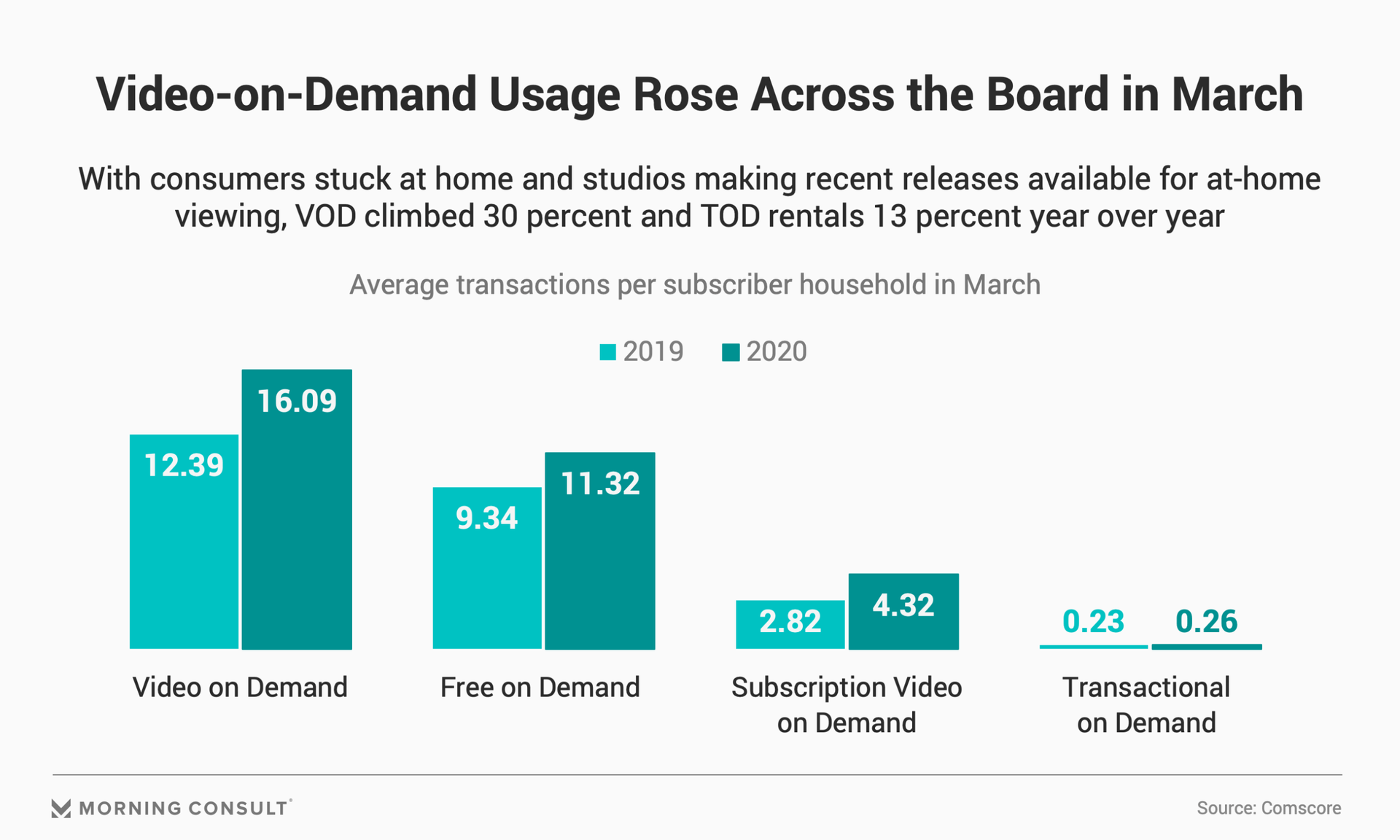 Data from Comscore Inc. found that VOD usage of all types increased nearly 30 percent year over year for the month of March, with subscribers averaging 16 transactions per household. Most movie theaters across the country closed in March, as the coronavirus spread and states and localities began issuing shelter-in-place orders.
