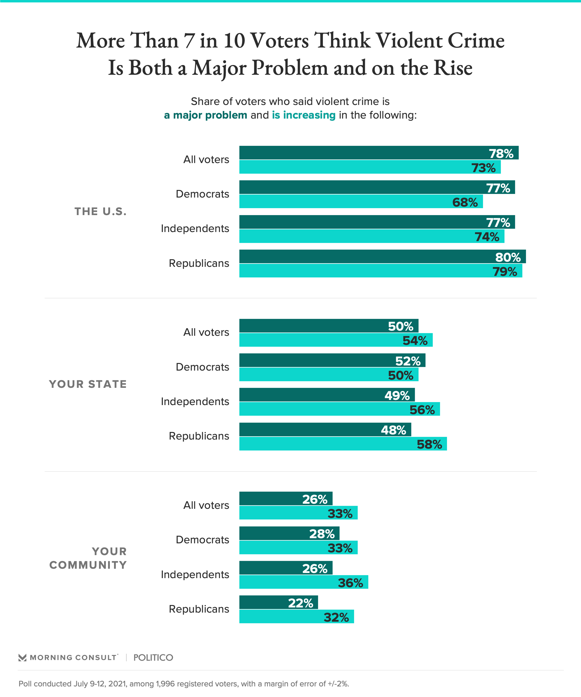 A large majority of voters agree that 2021’s rise in violent crime in the United States is a significant, increasing problem, according to a new Morning Consult/Politico poll, but Democrats and Republicans have starkly different views about its contributing factors and how to fix it.
