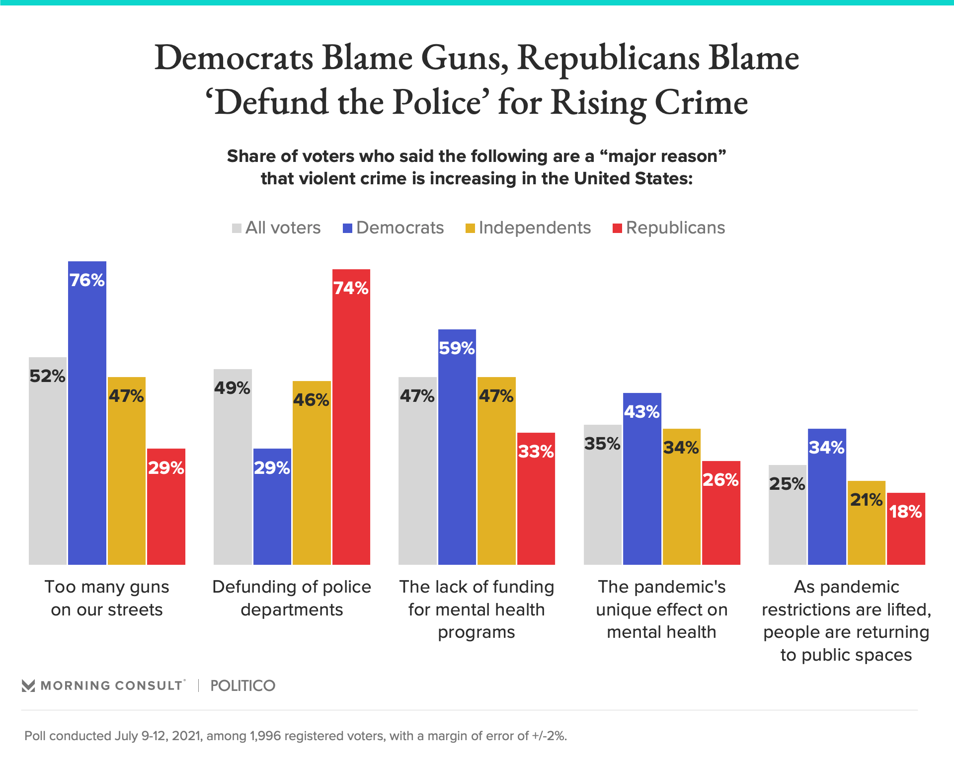 52% identified “too many guns on our streets” as a “major reason” that violent crime is increasing in the United States and 49% blamed police defunding.