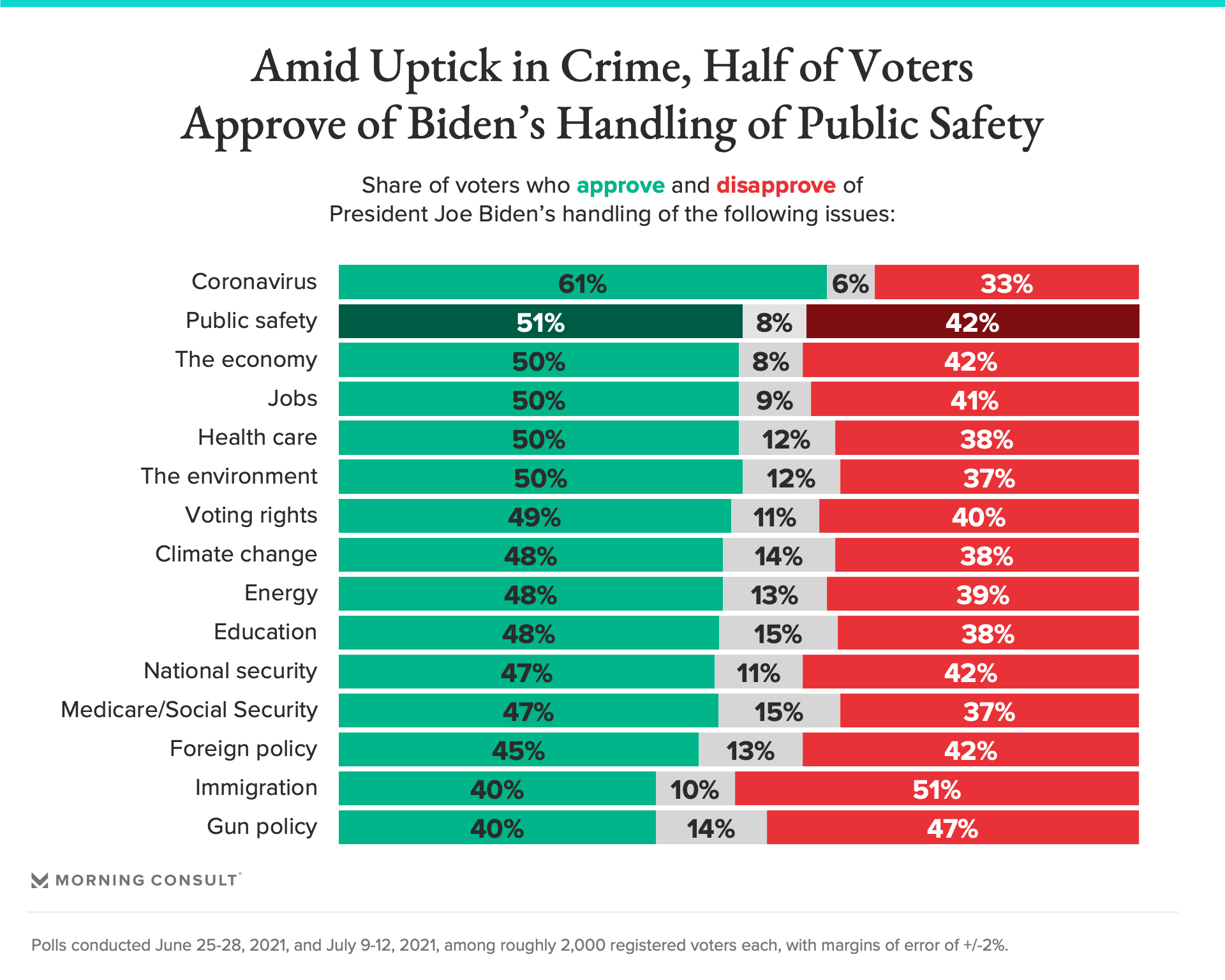 About half of voters (51 percent) said they approve of Biden’s handling of public safety, higher than any other issue except his handling of the COVID-19 pandemic in a previous Morning Consult/Politico poll, while 42 percent disapprove. Democrats are 8 points more likely to approve of Biden’s handling of public safety than Republicans are to disapprove.