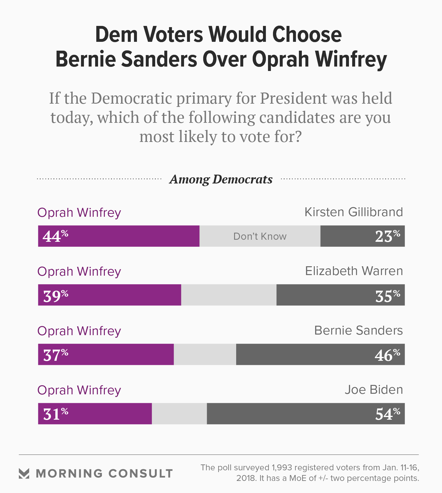 In head-to-head primary matchups with a handful of possible Democratic 2020 contenders, Winfrey performed best against New York Sen. Kirsten Gillibrand among Democrats, leading her 44 percent to 23 percent. She also leads Massachusetts Sen. Elizabeth Warren 39 percent to 35 percent. The poll found Vermont Sen. Bernie Sanders (I) would beat Winfrey, 46 percent to 37 percent. But former Vice President Joe Biden would beat Winfrey by a larger margin, 54 percent to 31 percent, among Democrats.