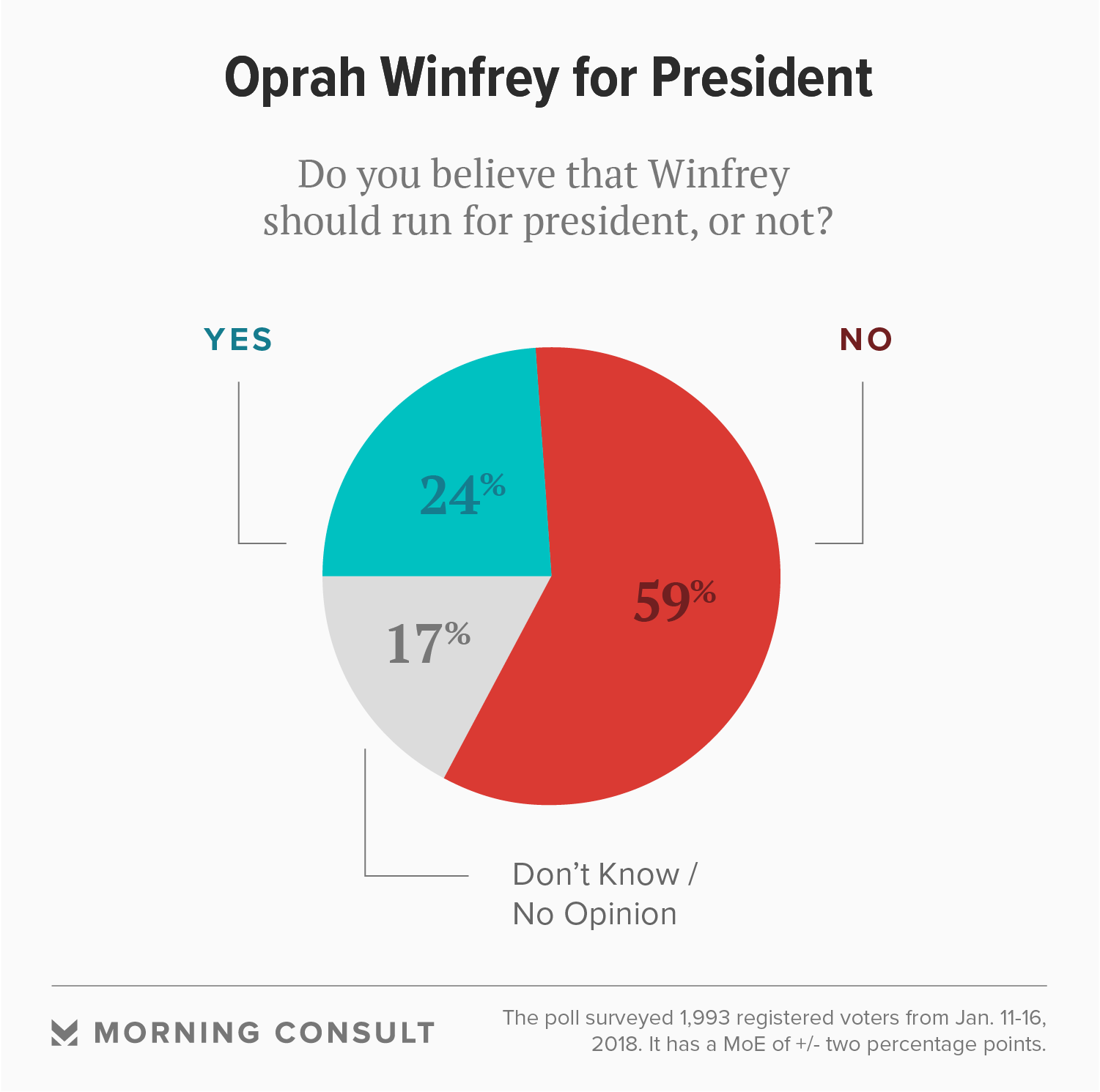 The Morning Consult/Politico poll was conducted Jan. 11-16 among a national sample of 1,993 registered voters, in the days following Winfrey's Jan. 7 speech at the Golden Globes that sparked talk of a potential bid for political office. Fifty-nine percent of survey respondents said Winfrey should not run for president, compared to 24 percent who said she should. Seventeen percent said they did not know or had no opinion.