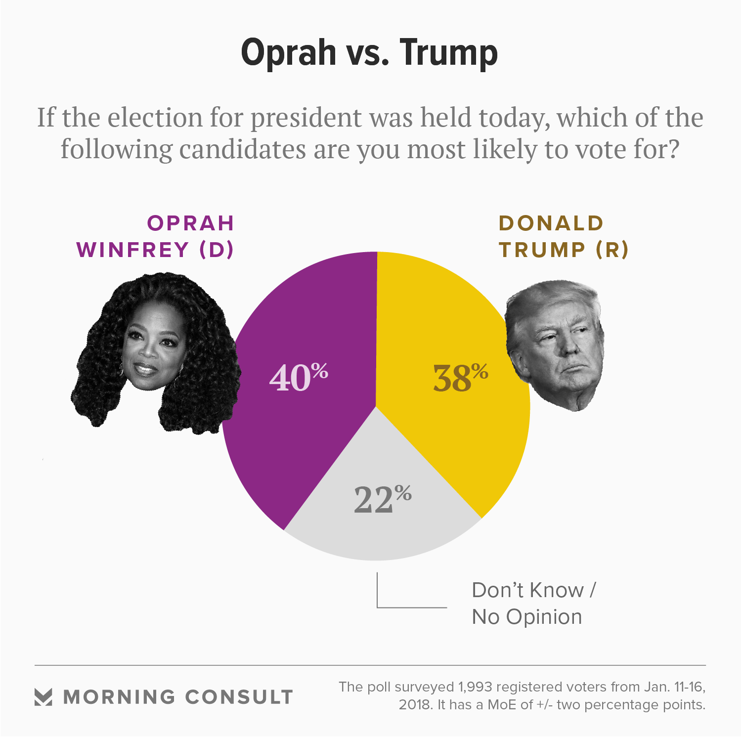 If the election were held today, Winfrey would lead Trump 40 percent to 38 percent, within the poll’s plus or minus 2-percentage point margin of error.