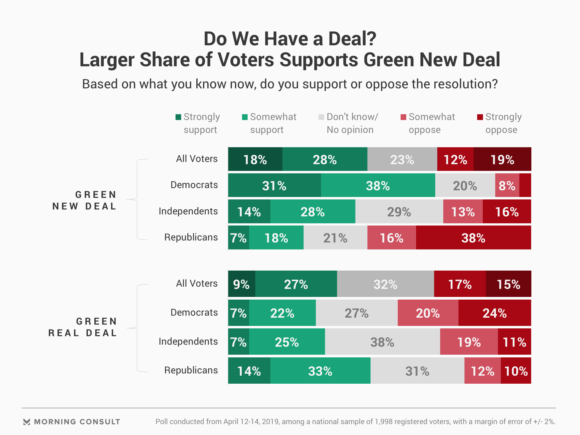 The Green New Deal is more popular with voters than the Green Real Deal by 10 points, with 46 percent in support of the former and 36 percent in support of the latter.