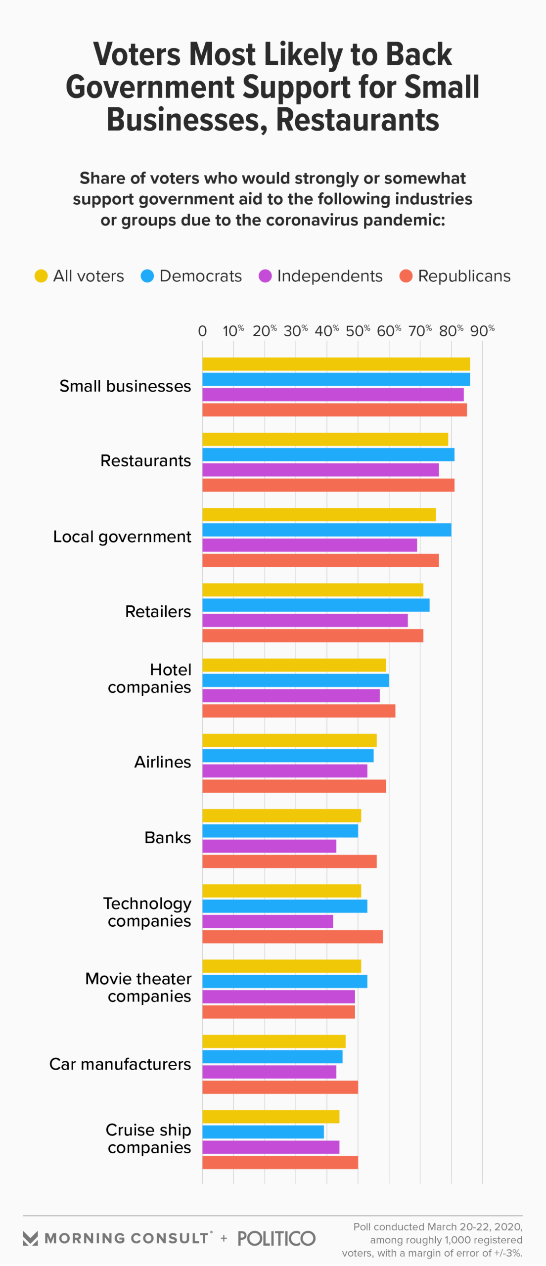 Voters do not view federal government help for all industries and groups equally, however. Across political parties, it’s largely small businesses, restaurants and local governments that voters want to see receive federal government support, according to a new Morning Consult/Politico poll.